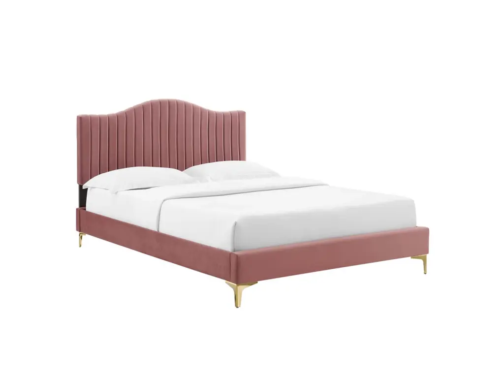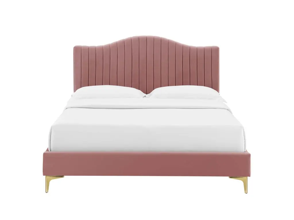 Bring opulent style to the bedroom with the Juniper Performance Velvet Platform Bed. The channel tufting, sweeping curved silhouette, and rich texture of the twin size headboard introduces glam deco style and vintage modernity to a kid's bedroom or guest room. A twin size bed frame covered in stain-resistant performance velvet, this upholstered bed frame is a sturdy mattress foundation for memory foam, innerspring, latex, and hybrid mattresses. Eliminating the need for a box spring, the MDF frame of this twin bed is complete with a wood slat support system crafted with poplar for lasting durability and support. This slatted bed frame rests on gold metal legs with non-marking foot caps and includes a reinforced center beam with two support legs for enhanced stability. Assembly required. Twin Bed Weight Capacity: 800 lbs.