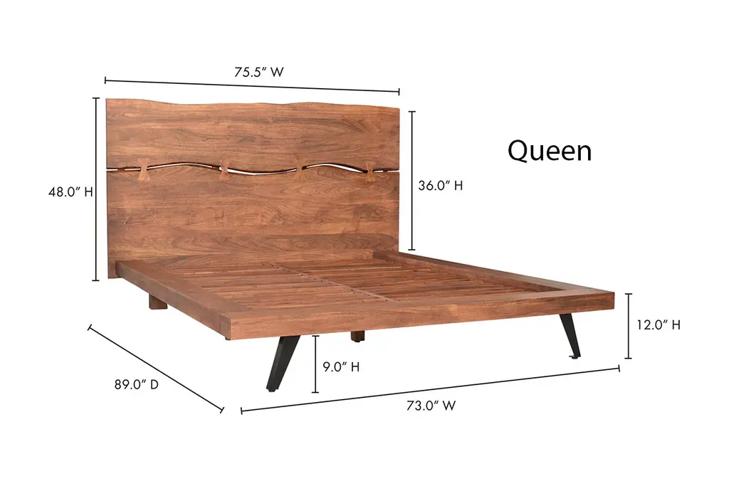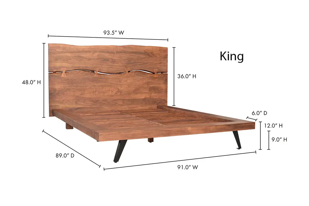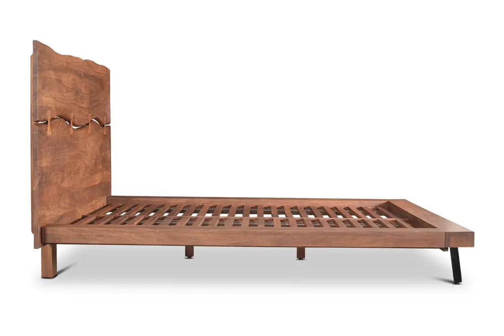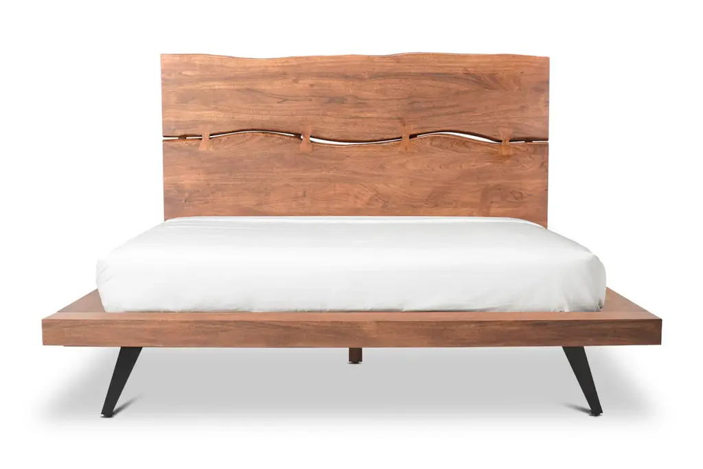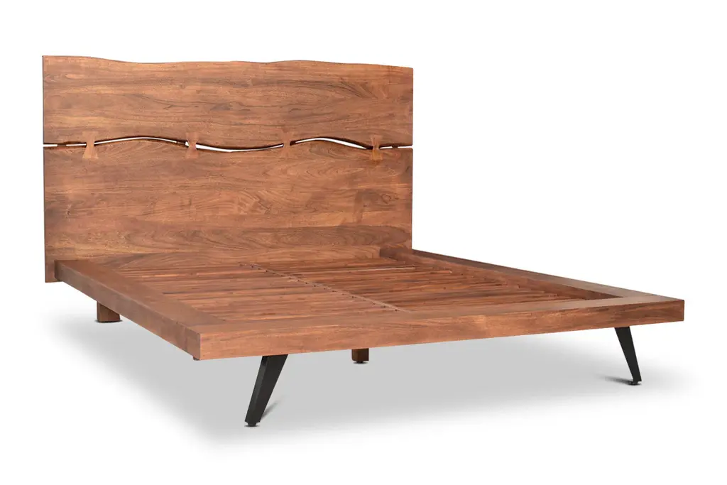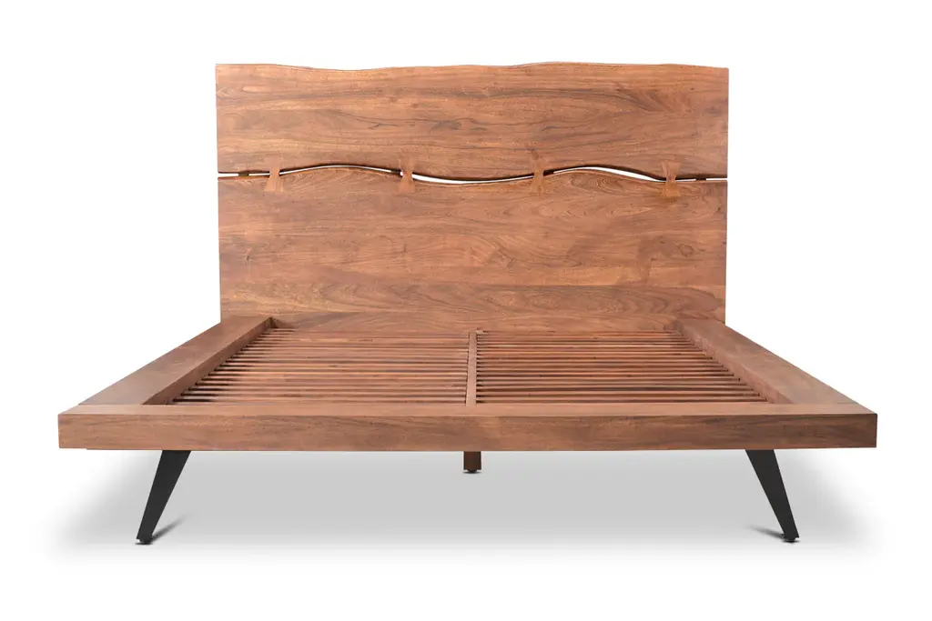 Experience the perfect blend of rustic charm and contemporary style with the Morgana Platform Bed. Crafted from rich acacia wood, this wood platform bed showcases a stunning natural grain and warm tones that bring organic beauty into your bedroom. The headboard features a unique, sculptural design with artistic cutouts that add a distinctive focal point to your space. Its low-profile frame, supported by sleek angled metal legs, ensures sturdy durability while maintaining a minimalist silhouette. Ideal for those who appreciate craftsmanship and modern rustic elegance, the Morgana Platform Bed promises both comfort and timeless style.