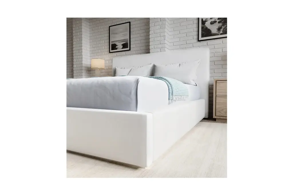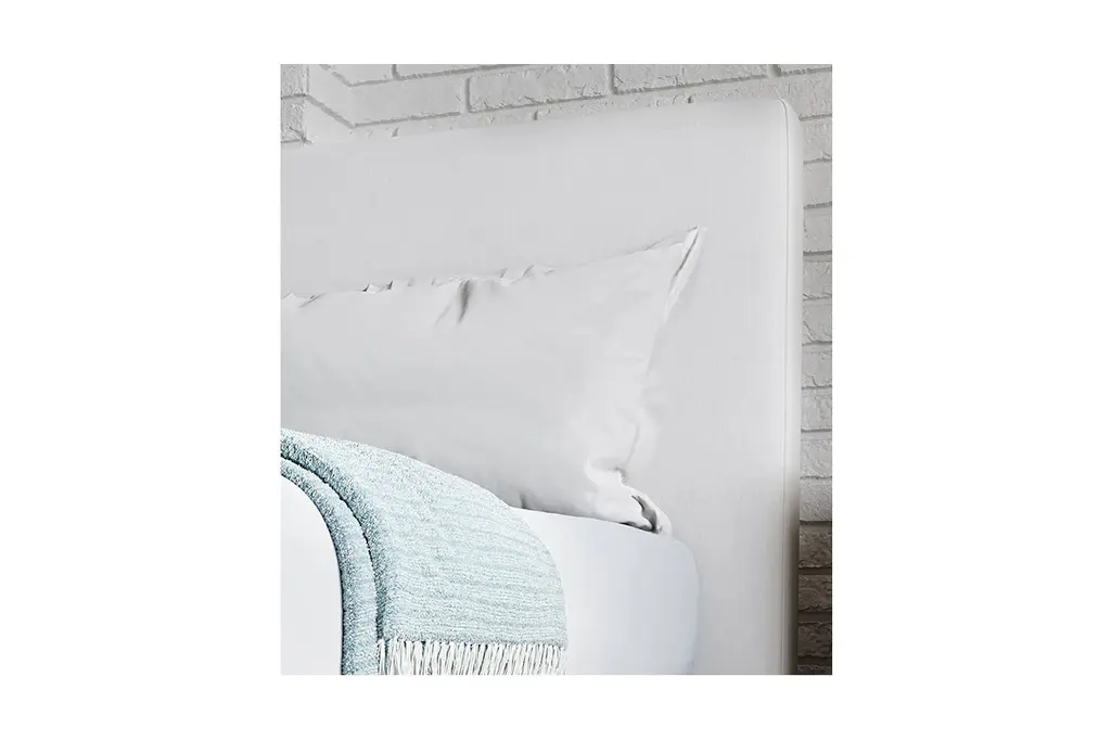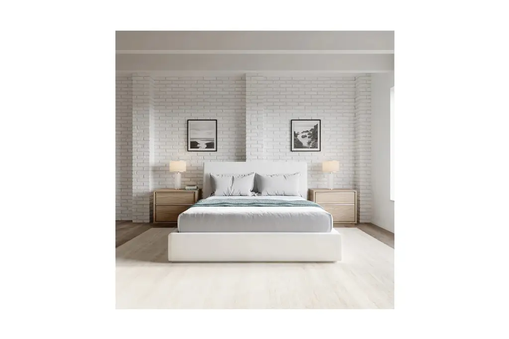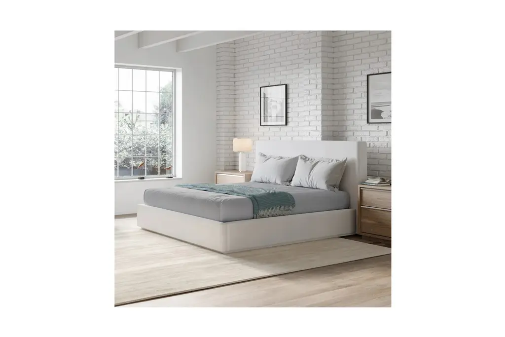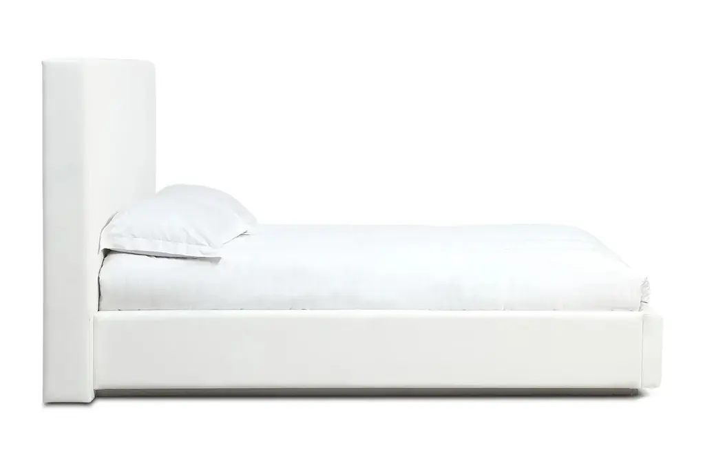 The Nash Platform Bed is a picture of elegance. Upholstered in a soft, white performance fabric, the headboard and frame offer a bold, tailored look that drips with modern style. It features metal support legs and wooden slats and does not require a box spring. Pile it high with fluffy pillows and linens for a cozy nest you'll never want to leave.