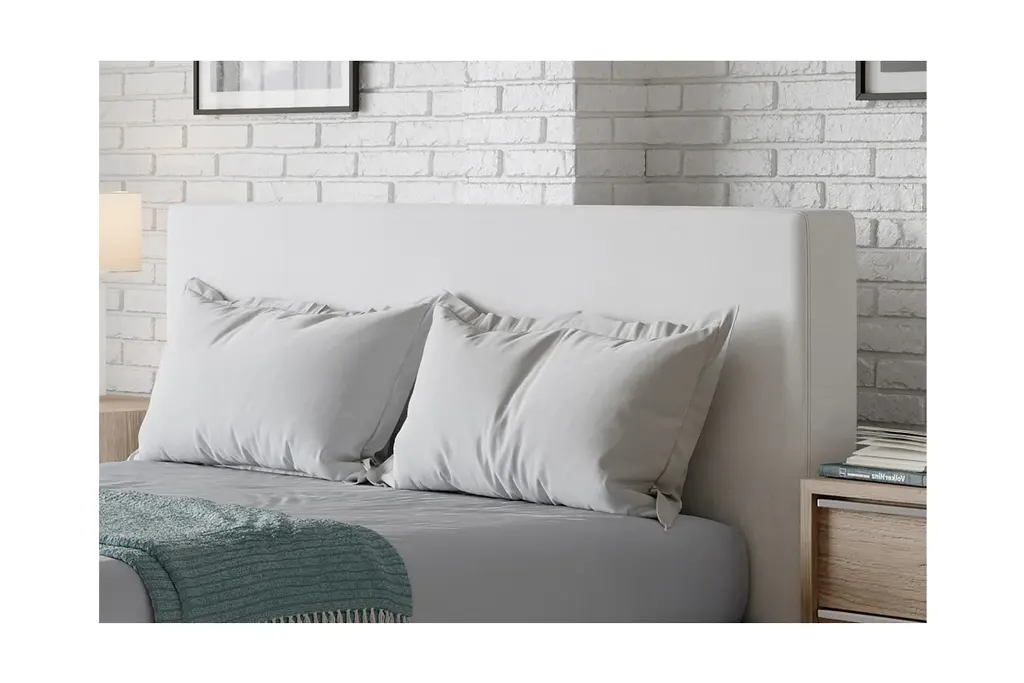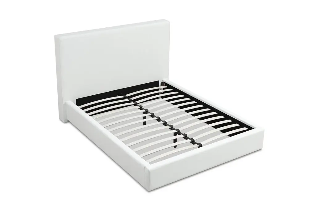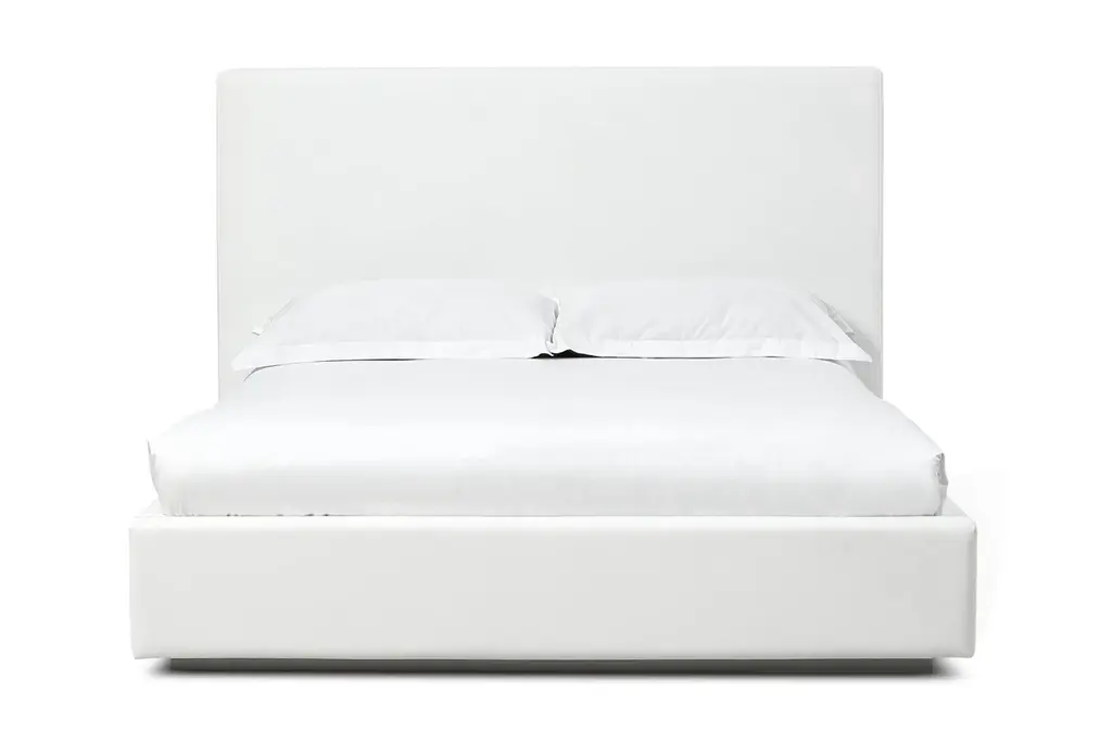 The Nash Platform Bed is a picture of elegance. Upholstered in a soft, white performance fabric, the headboard and frame offer a bold, tailored look that drips with modern style. It features metal support legs and wooden slats and does not require a box spring. Pile it high with fluffy pillows and linens for a cozy nest you'll never want to leave.