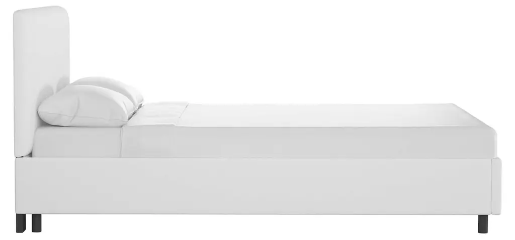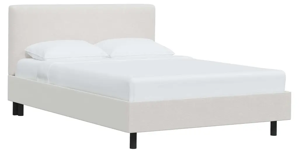 A clean-lined silhouette and amply padded linen-blend upholstery give this platform bed a tailored look, beautifully offset by neutral linen-blend fabric. Mattress required. Handcrafted in the USA.