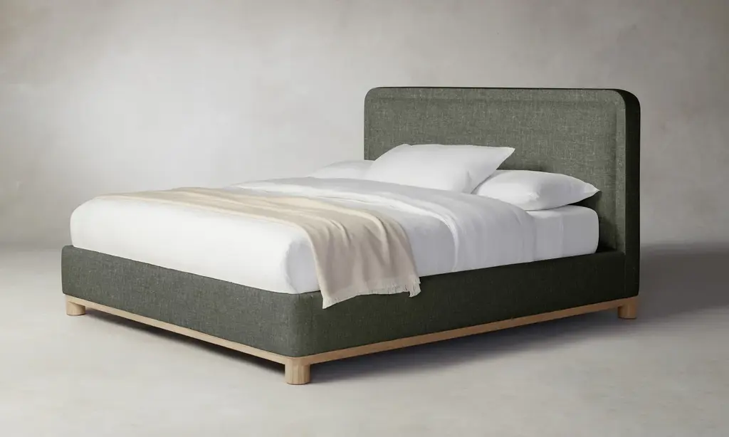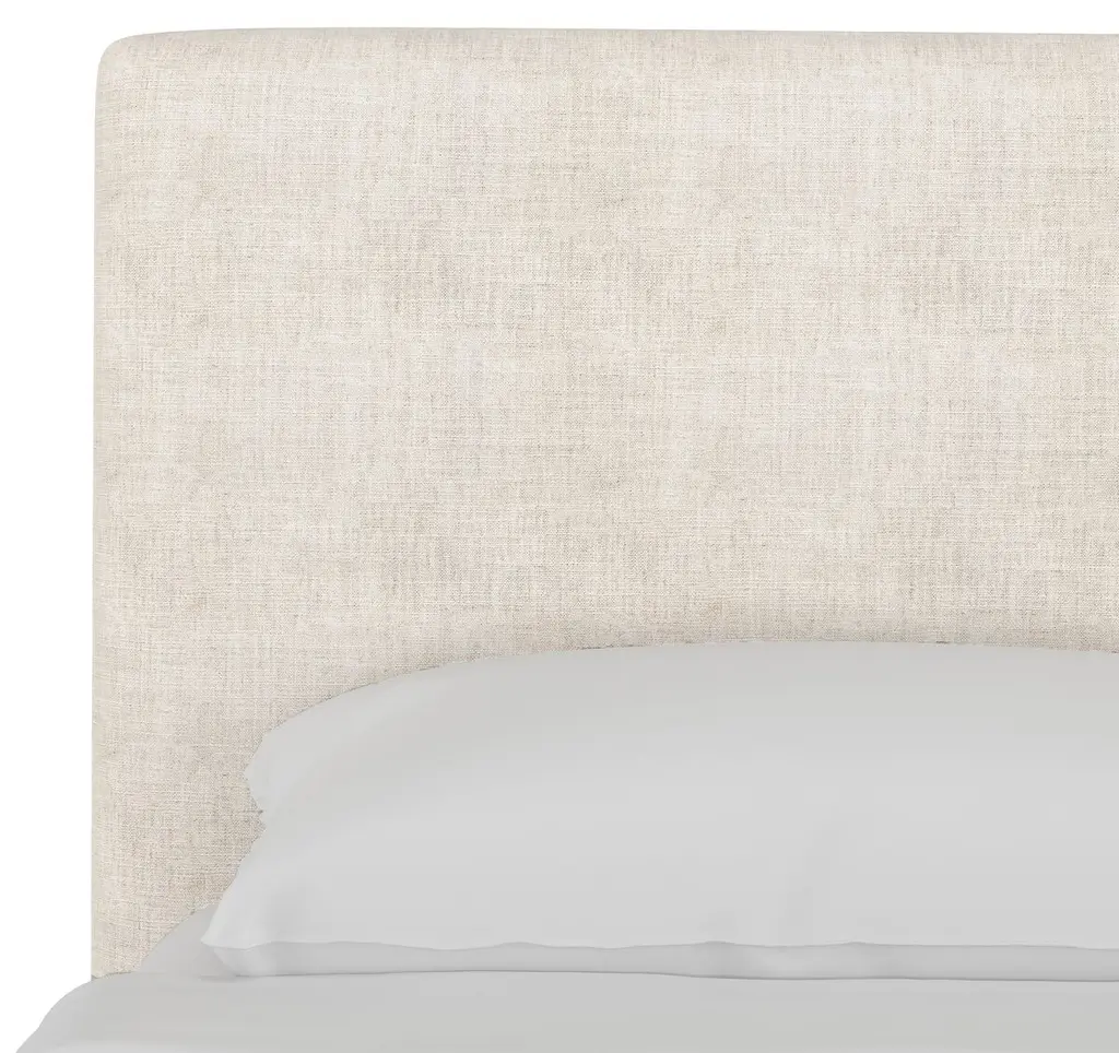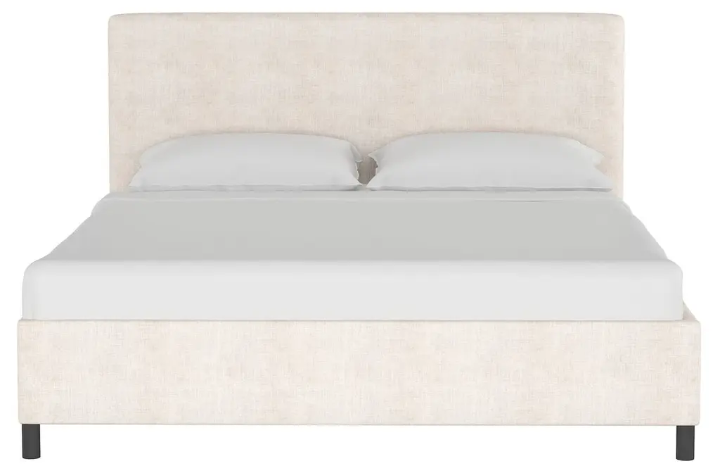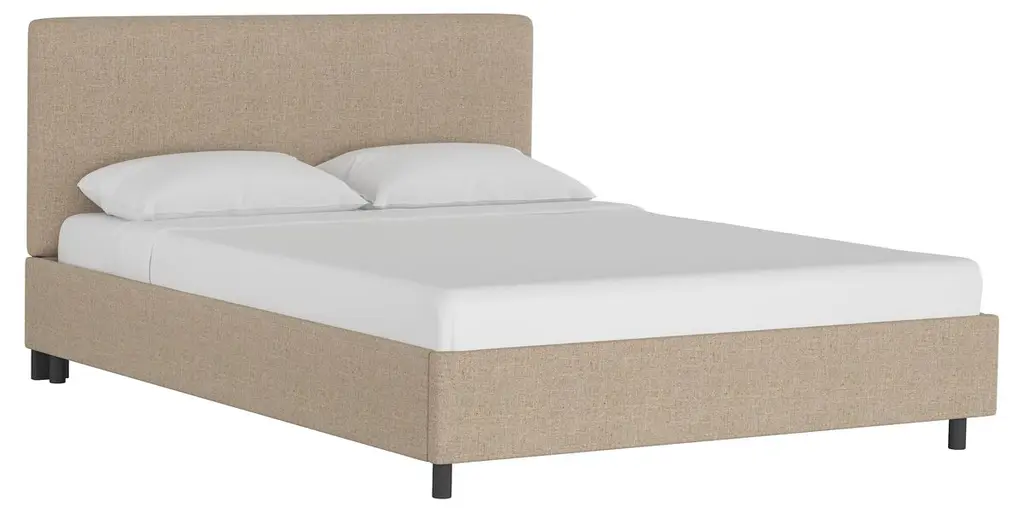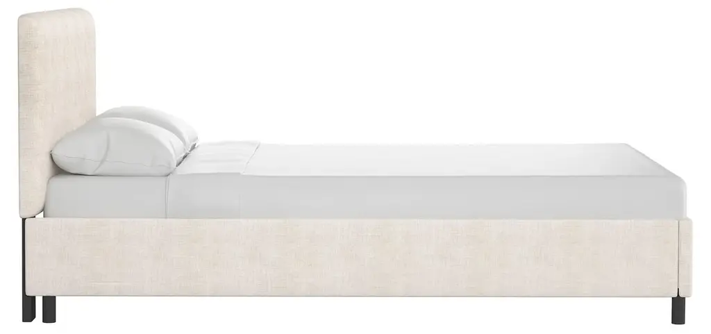 A clean-lined silhouette and amply padded linen-blend upholstery give this platform bed a tailored look, beautifully offset by neutral linen-blend fabric. Mattress required. Handcrafted in the USA.
