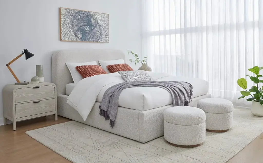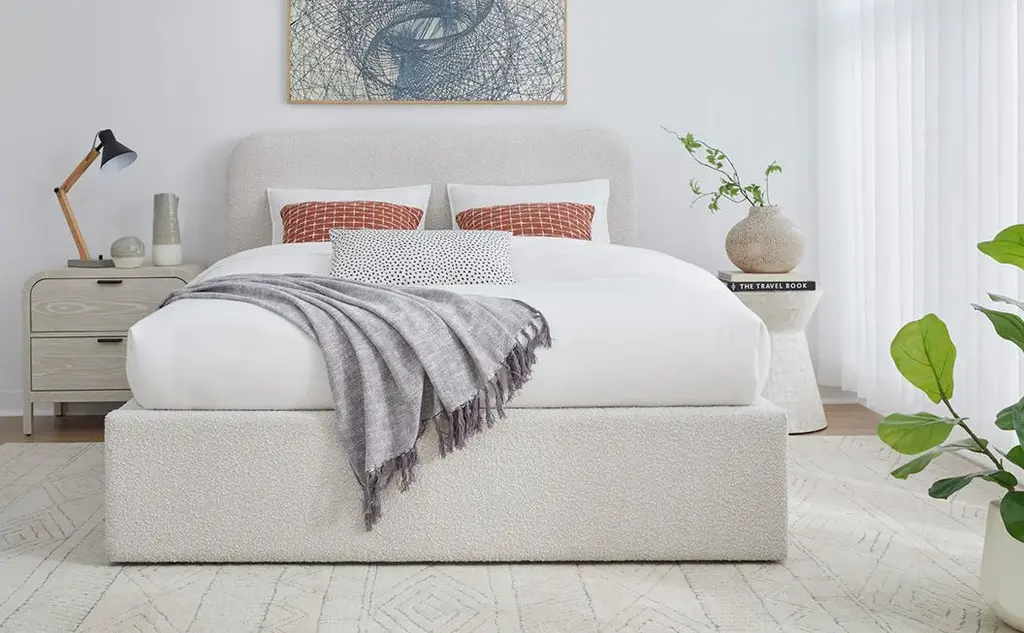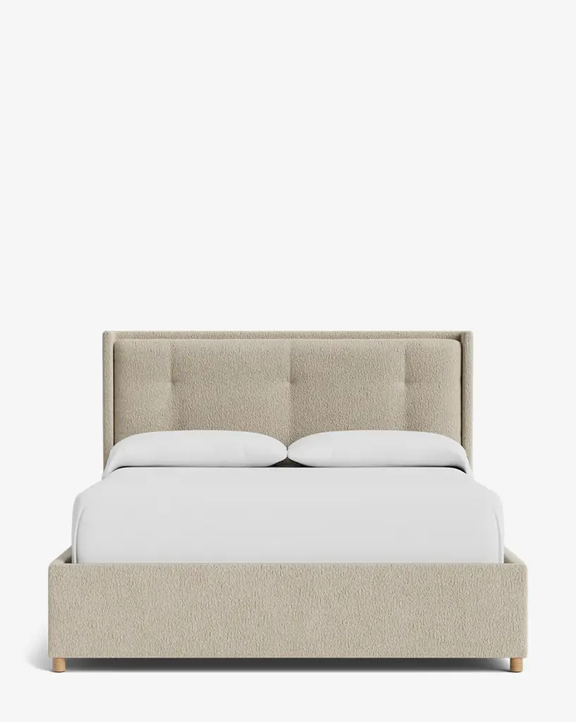 It's hard to find a more captivating bed than the Orion Upholstered Platform Bed at Apt2B. With rounded edges and layered foam padding, this dreamy neutral bed is the epitome of cozy. Featuring an upscale, contemporary design and European-style bentwood mattress support frame, this functionality supports the mattress directly making a box spring unnecessary. Available in Full, Queen, King and California King sizes.