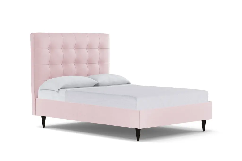 The Palmer Drive Upholstered Platform Bed is an utterly contemporary bed with a nod to the timeless stylings of Mid Century Modern design. This eye-catching, fully-upholstered platform bed features a button-tufted headboard and elegant conical legs. These details provide the sharp, clean, contemporary look that define the Palmer. Your pets will also appreciate the 7"h legs, which provide plenty of room for exploration and afternoon naps. The Palmer, designed by Apt2B resident designer Kyle Schuneman, is fully-upholstered, which means it can be admired from every angle. No detail of the Palmer Upholstered Bed has been overlooked - this upholstered bed is all buttoned-up and ready to ship out to your home! The Palmer Drive Upholstered Platform Bed is one of Apt2B's fantastic beds that we actually build to order in our downtown Los Angeles factory (made in the USA!). The Palmer Drive is available as a Queen size, King size, California King size, and a Full size by request! Although the Palmer is a true platform bed with wooden slats, it does require a bunkie board or box spring for added support. The Palmer Drive is also available in your choice of fabrics. You can choose from any Apt2B's vast selection of kid friendly and pet friendly fabric offerings! Whether you're looking for a grey upholstered bed or a pink upholstered bed the Palmer Drive has got you covered.