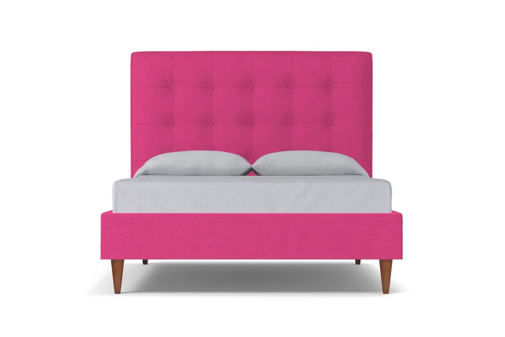 The Palmer Drive Upholstered Platform Bed is an utterly contemporary bed with a nod to the timeless stylings of Mid Century Modern design. This eye-catching, fully-upholstered platform bed features a button-tufted headboard and elegant conical legs. These details provide the sharp, clean, contemporary look that define the Palmer. Your pets will also appreciate the 7"h legs, which provide plenty of room for exploration and afternoon naps. The Palmer, designed by Apt2B resident designer Kyle Schuneman, is fully-upholstered, which means it can be admired from every angle. No detail of the Palmer Upholstered Bed has been overlooked - this upholstered bed is all buttoned-up and ready to ship out to your home! The Palmer Drive Upholstered Platform Bed is one of Apt2B's fantastic beds that we actually build to order in our downtown Los Angeles factory (made in the USA!). The Palmer Drive is available as a Queen size, King size, California King size, and a Full size by request! Although the Palmer is a true platform bed with wooden slats, it does require a bunkie board or box spring for added support. The Palmer Drive is also available in your choice of fabrics. You can choose from any Apt2B's vast selection of kid friendly and pet friendly fabric offerings! Whether you're looking for a grey upholstered bed or a pink upholstered bed the Palmer Drive has got you covered.
