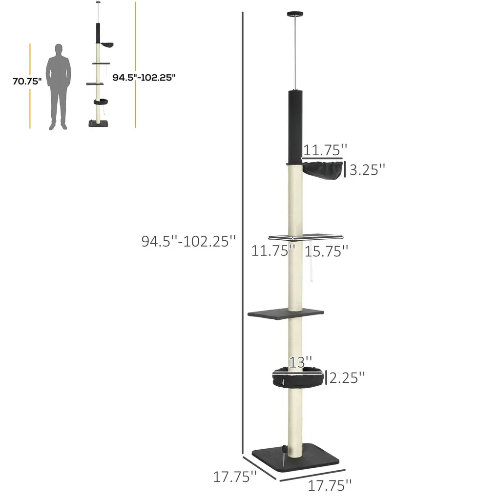 Descriptions:Cats are active they do sufficient activities every day. They enjoy jumping, running, hiding, scratching, and lounging, which makes them healthy and happy. A towering and good-quality kitty tower is a place for cats to do those activities. It features scratching areas, offering them plenty of places to stretch and exercise their claws. Your little ones will have an absolute blast with this easy-to-install PawHut cat tree with multiple platforms!Features:● 94.5" - 106.25'' adjustable height with an anti-topple strap offers your cats a great spot to survey the land (your home) around them● Multiple levels, satisfying your pet's urge to climb● Include sisal-wrapped posts so that cats can scratch and dig their claws ● Spacious cat bed and hammock, providing extra comfort ● Toy ball for fun – perfect for when they're feeling playful ● Suitable for cats under 10lbs, assembly requiredSpecification:● Color: Black and Cream● Material: Particleboard, Plush, Sisal● Overall Dimension: 17.75" L x 17.75" W x 94.5" -106.25" H ● Bed Size: Φ13'' x 2.25'' H● Platform Size: 15.75'' L x 11.75'' W● Hammock Size: Φ11.75'' x 3.25'' H● Column Size: Φ3"● Recommend Pet Weight: under 10lbs● Item Label: D30-617V00BK