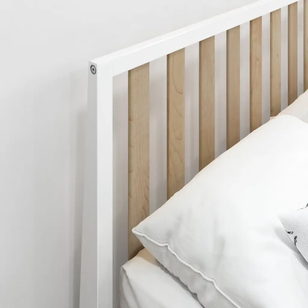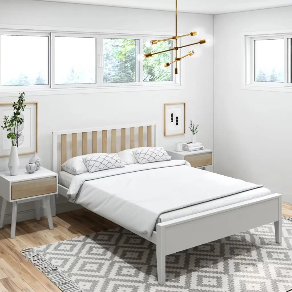 Discover the beauty of modern, minimalist style with our Modern Solid Wood Full-Size Bed with Slatted Headboard. Crafted with solid wood, this full-size bed frame has a sleek, streamlined silhouette with an open, slatted headboard and modern neutral finishes. Made with clean, non-toxic finishes, this full-size bed frame complements your healthy living space. Strong metal-on-metal connections provide increased strength and stability, while a plywood slat roll and metal support bar create a high 400 lb. resting weight capacity. This bed fits standard full-size mattress sizes and can accommodate all mattress types including memory foam, spring, hybrid, or latex. Full size bed frame is easy to assemble with instructions, tools, and hardware included. Bring Scandinavian-inspired style and superior craftsmanship to your bedroom with the Modern Full-Size Bed with Slatted Headboard from Plank+Beam.