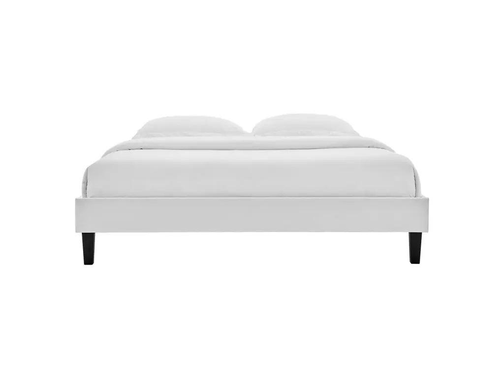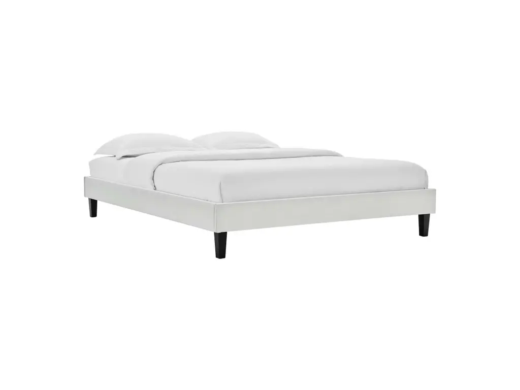 Transform your bedroom decor with the subtle glam deco style of the Reign Performance Velvet Queen Platform Bed Frame. Covered in soft, stain-resistant performance velvet, this upholstered bed boasts rich texture on the simple design of the sturdy side rails. Resting atop tapered black wood legs, the queen size bed frame is a sturdy mattress foundation for memory foam, latex, innerspring, and hybrid mattresses. Eliminating the need for a box spring, this platform bed is complete with a poplar wood slat support system, a reinforced center beam, and supporting legs for lasting stability. Compatible with a variety of queen headboard designs, this queen platform bed also makes a striking statement as a stand-alone piece in the master bedroom or guest bedroom. Mattress not included. Assembly required. Queen Bed Frame Weight Capacity: 800 lbs.