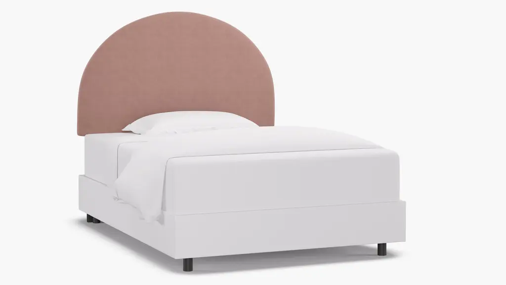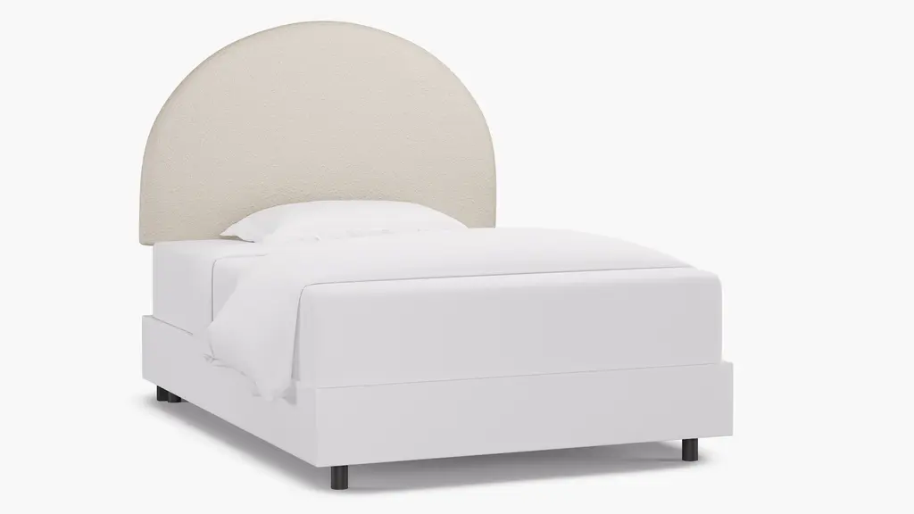 Soft lines bring a modern silhouette to the Rigby platform bed. Oversized bun feet float the upholstered bed frame with a grounding touch of light wood grain. Bespoke fabric options let you set the tone for a personalized bedroom edit.