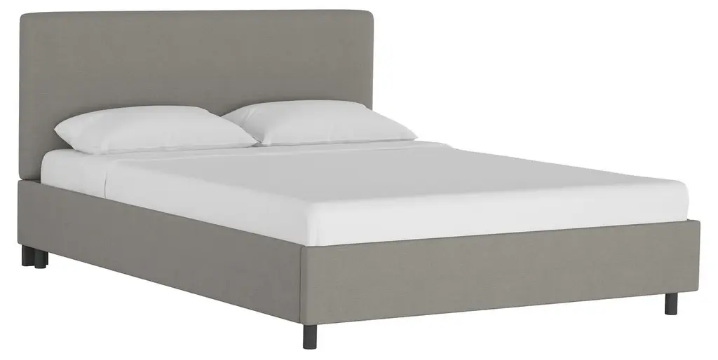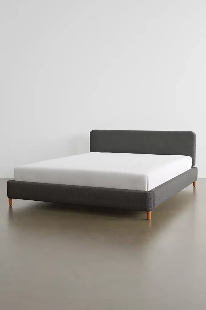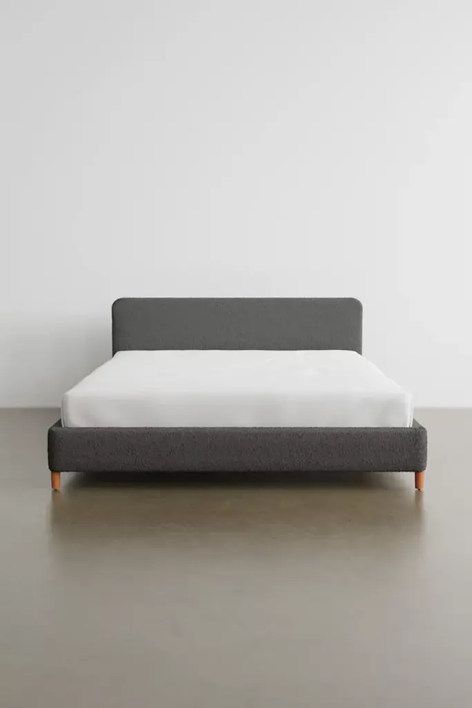Bring clean, cozy lines to your space with this upholstered platform bed frame. Featuring a sleek upholstered headboard and frame with pine wood legs and slatted base. Upholstered allover in looped boucle fabric that's so cozy. This custom furniture piece will be made to order just for you. Available exclusively at Urban Outfitters.