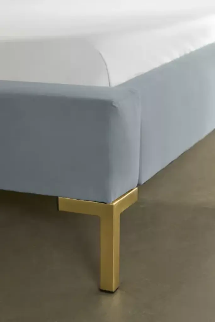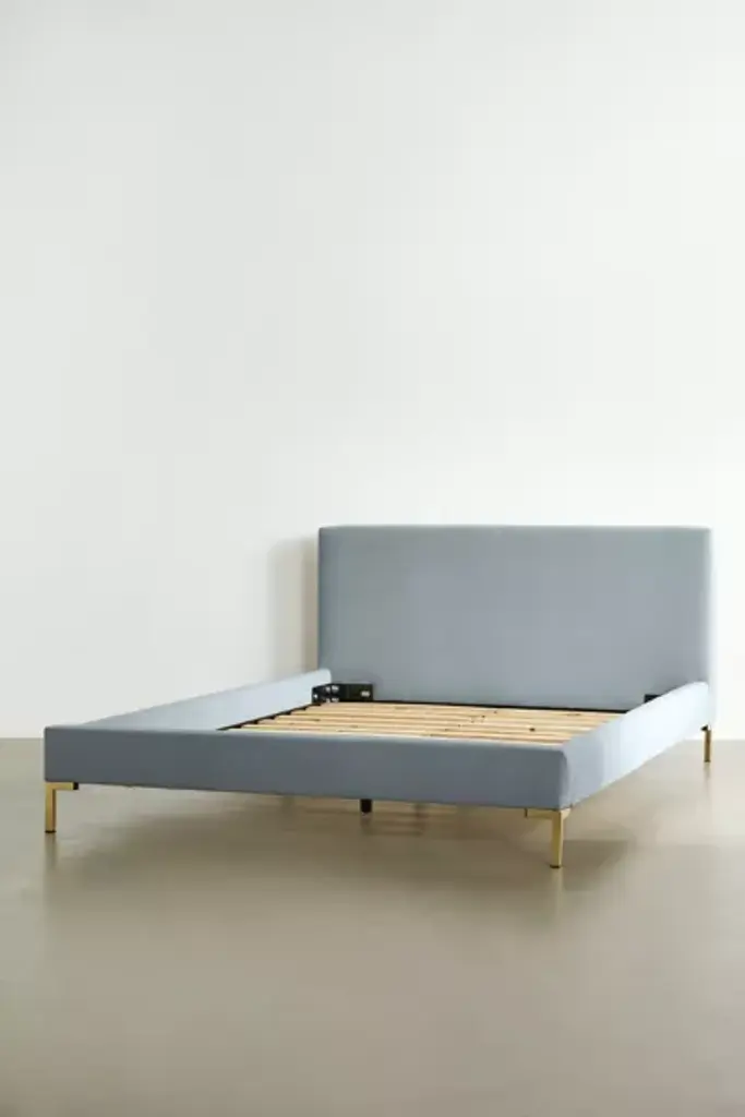 Have a night full of sweet and luxurious dreams in this velvet platform bed. Complete with a sleek silhouetted headboard, brass-finished legs & a slatted base, this platform bed will bring a chic and modern look to your space. This custom furniture will be made to order just for you. Two people recommended for assembly. **Features** \- Upholstered platform bed \- Finished with allover velvet upholstery for a luxe feel \- Made to order just for you \- Assembly required **Content + Care** \- Assembly required - instructions and hardware included \- Solid pinewood, polyurethane, polyester fill \- Spot clean \- Made in the USA **Size** Twin \- Dimensions: 45"l x 85"w x 37"h \- Headboard dimensions: 45"l x 4"w x 37"h \- Mattress space dimensions: 75"l x 39"w \- Leg height/clearance: 6" \- Weight: 116 lbs \- Shipping package 1 dimensions: 33"l x 6"w x 47"h \- Shipping package 2 dimensions: 16"l x 11"w x 78"h \- Shipping package 1 weight: 21 lbs \- Shipping package 2 weight: 91 lbs Full \- Dimensions: 60"l x 85"w x 37"h \- Headboard dimensions: 60"l x 4"w x 37"h \- Mattress space dimensions: 75"l x 54"w \- Leg height/clearance: 6" \- Weight: 131 lbs \- Shipping package 1 dimensions: 33"l x 6"w x 62"h \- Shipping package 2 dimensions: 16"l x 11"w x 78"h \- Shipping package 1 weight: 35 lbs \- Shipping package 2 weight: 100 lbs Queen \- Dimensions: 66"l x 90"w x 37"h \- Headboard dimensions: 66"l x 4"w x 37"h \- Mattress space dimensions: 80"l x 60"w \- Leg height/clearance: 6" \- Weight: 151 lbs \- Shipping package 1 dimensions: 33"l x 6"w x 68"h \- Shipping package 2 dimensions: 16"l x 11"w x 86"h \- Shipping package 1 weight: 45 lbs \- Shipping package 2 weight: 110 lbs King \- Dimensions: 82"l x 90"w x 37"h \- Headboard dimensions: 82"l x 4"w x 37"h \- Mattress space dimensions: 80"l x 76"w \- Leg height/clearance: 6" \- Weight: 172 lbs \- Shipping package 1 dimensions: 33"l x 6"w x 84"h \- Shipping package 2 dimensions: 16"l x 11"w x 86"h \- Shipping package 1 weight: 51 lbs \- Shipping package 2 weight: 125 lbs