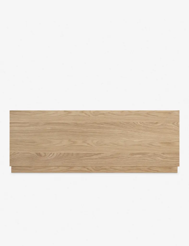 A beautiful platform bed from the Ryland Collection featuring solid oak construction with softly molded corners and a low-slung design. Clean, gentle lines and sleek wood grain are highlighted by a light, natural finish for a look that is understated and refined. This plinth base bed frame with headboard offers a sturdy silhouette that will ground your bedroom with a modern tone.