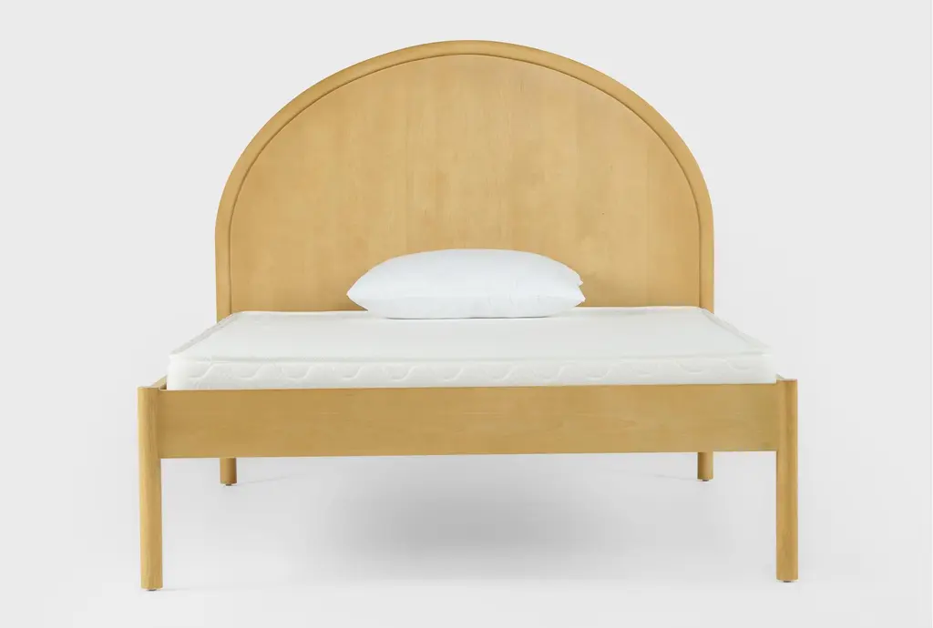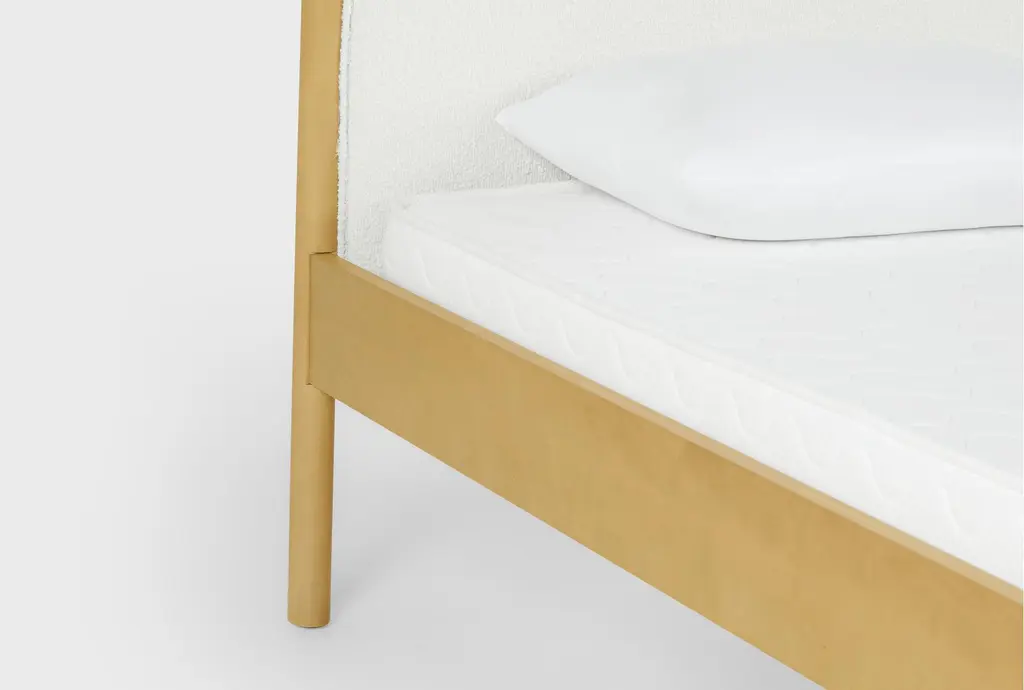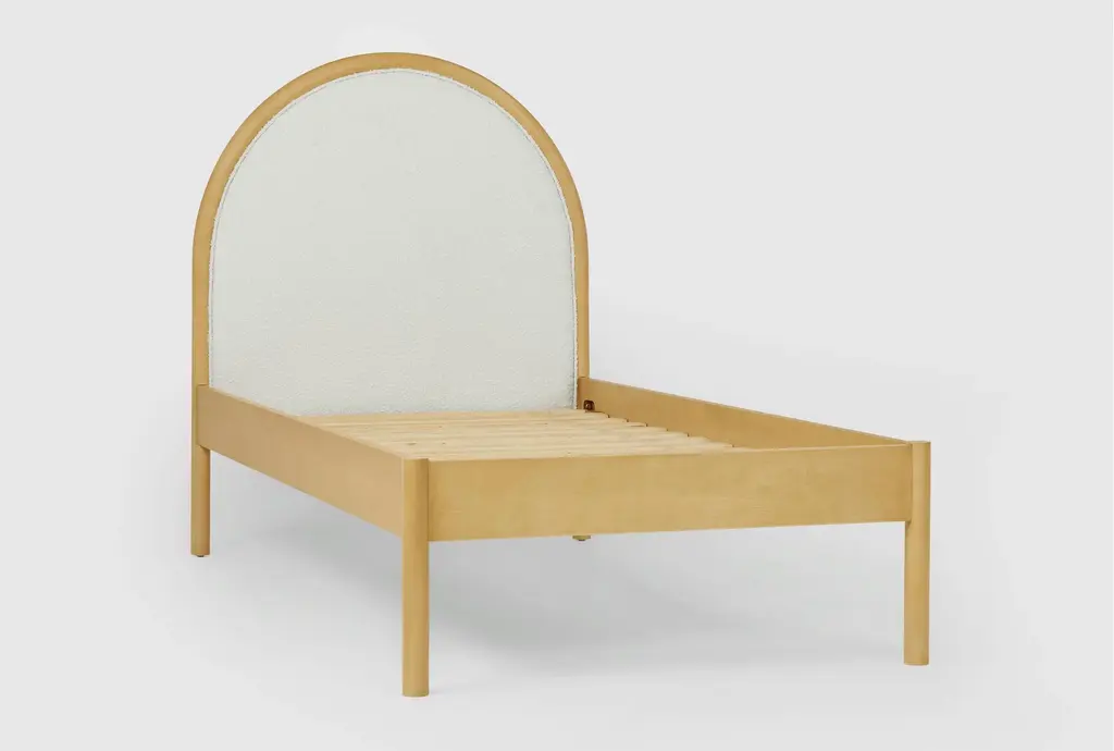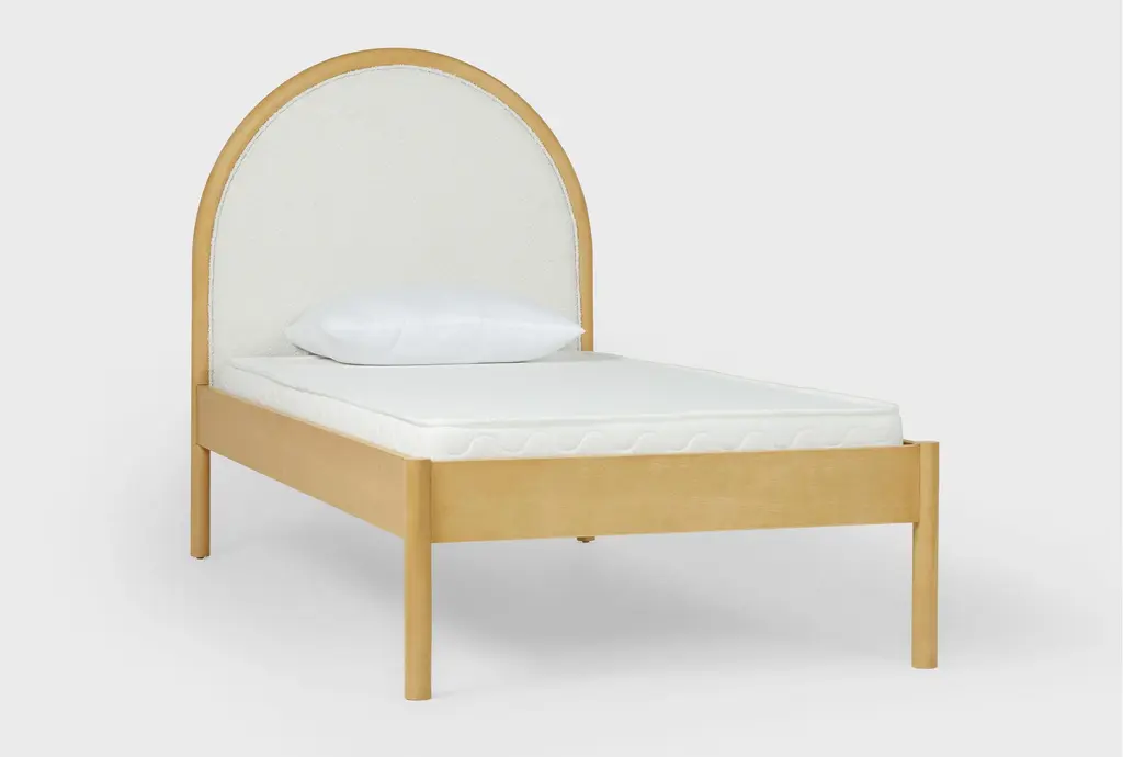 Introduce a touch of Scandinavian design to your kid's room with the Seren Twin Wood & Upholstered Platform Bed. Its natural wood finish and soft boucle upholstered headboard create a warm and inviting atmosphere. The platform design eliminates the need for a box spring, offering both style and functionality.