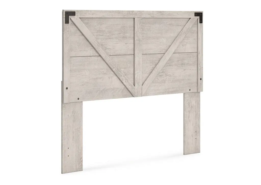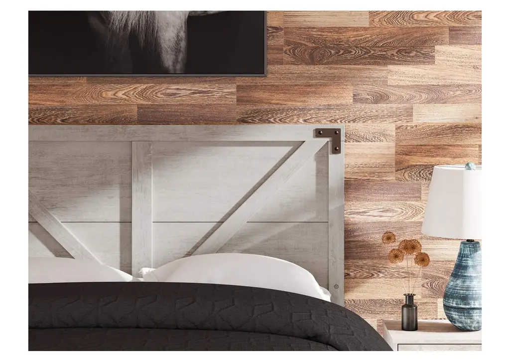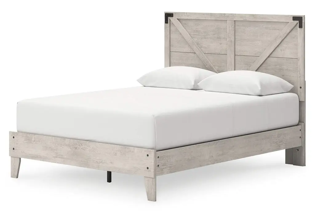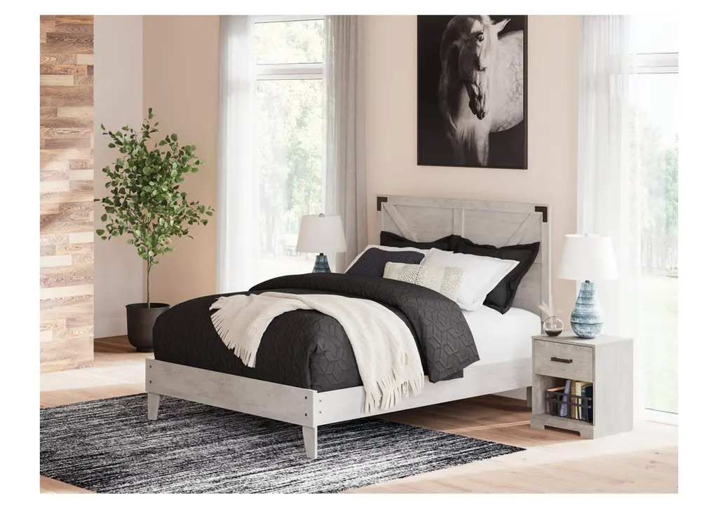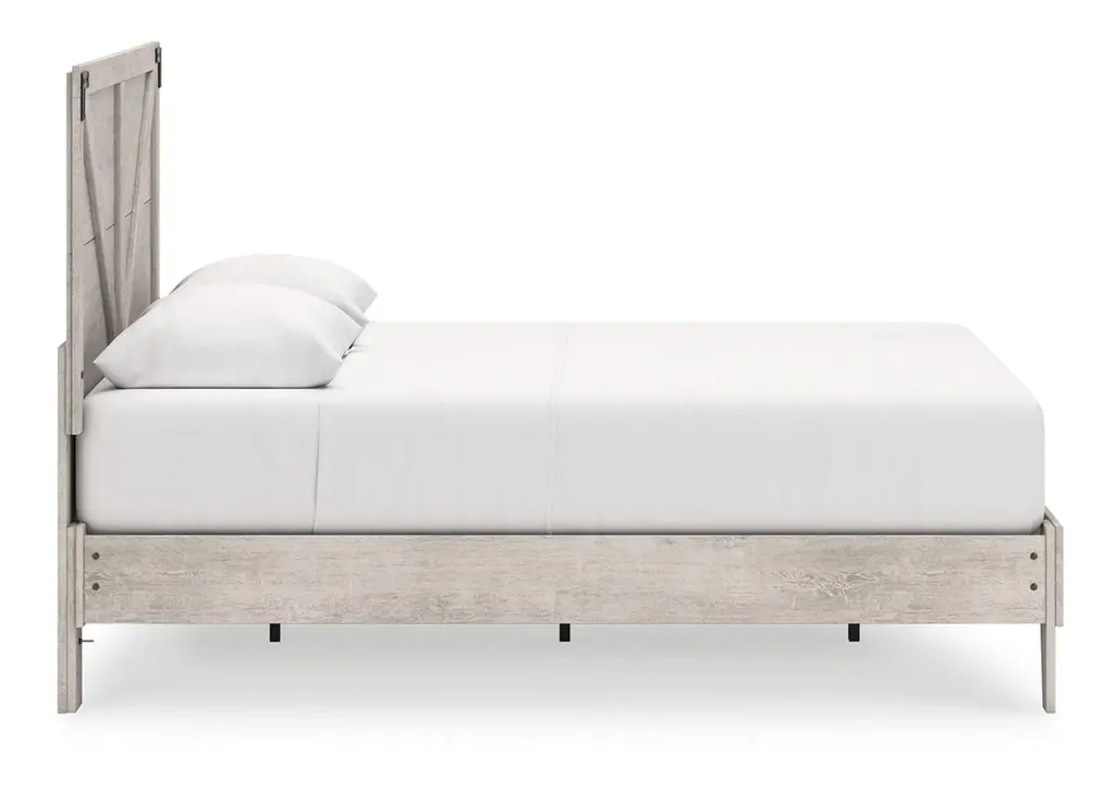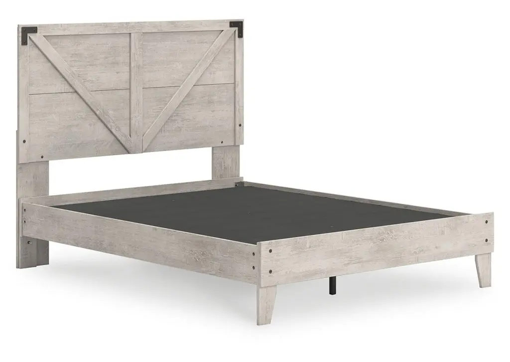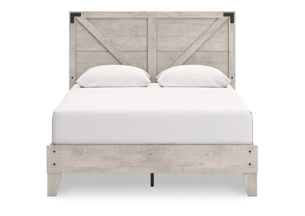Give casual a new meaning with the chic look of this queen platform bed. A light gray finish over replicated oak grain keeps it laid-back and inviting, while crossbuck details and pewter-tone accents add a modern farmhouse touch. Talk about a delightfully relaxed vibe in your inner sanctum. Weight 141.000 lbs. (63.45kgs.)