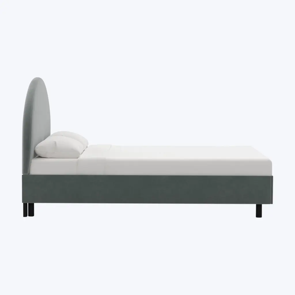 Illuminate your bedroom with the celestial elegance of the Solana Bed, a radiant centerpiece that brings the warmth of the sun and the serenity of the moon into your space. Its rounded headboard evokes a sense of calm and balance, while its minimalist legs seem to float like stars in the night sky. Crafted with care and precision in the United States, this bed is not only a visual masterpiece but also a testament to sustainable craftsmanship, using FSC-certified wood to ensure an eco-friendly choice for your home. Customers love the Solana Bed for guest rooms, children’s rooms, and vacation homes, where its serene and timeless design adds a touch of tranquility. The gentle curve of the headboard creates a soft, welcoming atmosphere, perfect for unwinding after a long day or providing a cozy sanctuary for your guests. Its versatile silhouette seamlessly blends with various interior styles, from natural bohemian vibes to sleek, modern spaces, making it a dream fit for any room. The bed’s platform frame is as functional as it is beautiful. With a wooden slat system that fits effortlessly onto its sturdy metal frame, there’s no need for a box spring—just pure, uninterrupted comfort. The simplicity of this design, paired with your choice of hand-selected fabrics, allows for customization to match your personal style. Choose from luxurious velvets, soft polyester blends, or textured boucle to create a bed that perfectly reflects the mood and theme of your space. Handmade with precision in the United States, the Solana Bed radiates quality and care in every detail. From the FSC-certified wood to the custom upholstery options, each element is designed with sustainability and elegance in mind. The minimalist legs and clean lines reflect the vast openness of the night sky, while the rounded headboard echoes the phases of the moon, creating a harmonious balance between form and function. The Solana Bed invites you to experience the cosmos within the comfort of your own home. Its celestial design and eco-conscious construction make it an out-of-this-world addition to any space, ensuring that every night feels like you're sleeping under the stars.