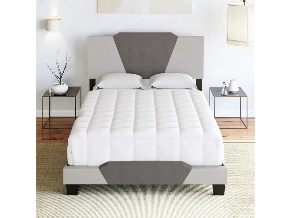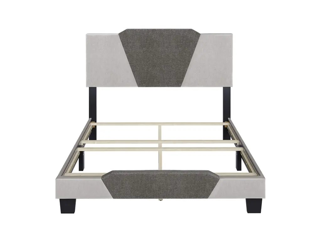 Bold block colors accentuate the unique diamond-shaped headboard and matching footboard of this upholstered bed frame. Bed is completely upholstered in linen and lightly padded for a premium look and feel. Base uses a quad cross-slat system and heavy-duty construction, that supports up to 700 lbs. A box spring or foundation is required with this base. Assembles in under 15 minutes. All hardware is included, conveniently zipped up in the back of the headboard. Entire bed ships in 1 box for easy transport. Limited 1 Year Warranty.