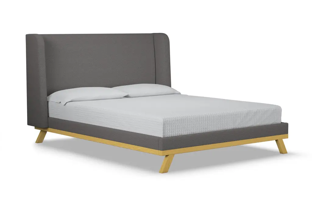 The Tatum Upholstered Platform Bed is the perfect marriage between fabric upholstery and solid wood accents. The Tatum utilizes a traditional shelter headboard design and makes it feel completely fresh and modern by placing it upon a solid wood base. Choose any of our high grade fabrics and you'll see just how expertly and beautifully the wood base contrasts and complements the upholstery. This is the modern bed that you've been dreaming of. The Tatum is built to order in our downtown Los Angeles factory (Made in the USA!) and it's handcrafted using high end components and materials. The frame is made from solid, kiln-dried Alder wood, the headboard is foam-wrapped for comfort, and the upholstery options are all graded for commercial use (yes that means they're also pet and kid friendly!). This is a true platform bed that features hardwood slats, but it does require a bunkie board as additional mattress support. This contemporary bed is one of the finest designs we've ever offered.