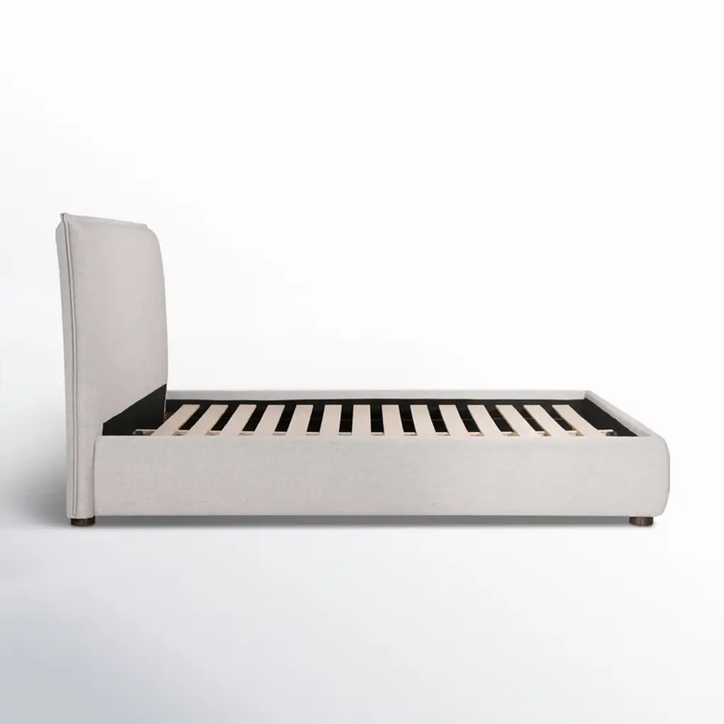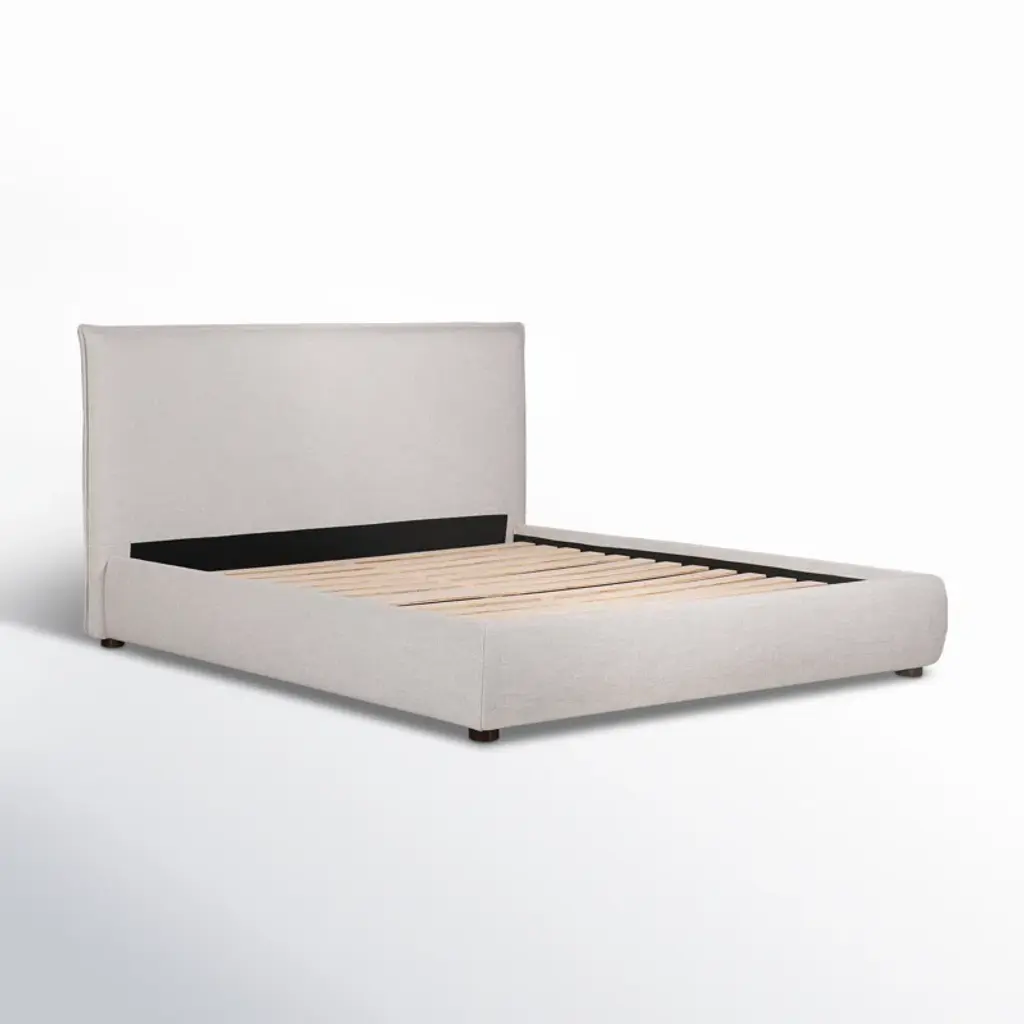 A French seam and neutral upholstery give this clean-lined bed its versatile, elegant look and feel. This bed includes a headboard, footboard, and rails made from solid pine, poplar, and engineered wood. The upholstery adds a tailored touch, while foam fill in the headboard offers a cozy place to kick back. Plus, thanks to the sturdy system of slats, you can add your preferred mattress without the need for a box spring.