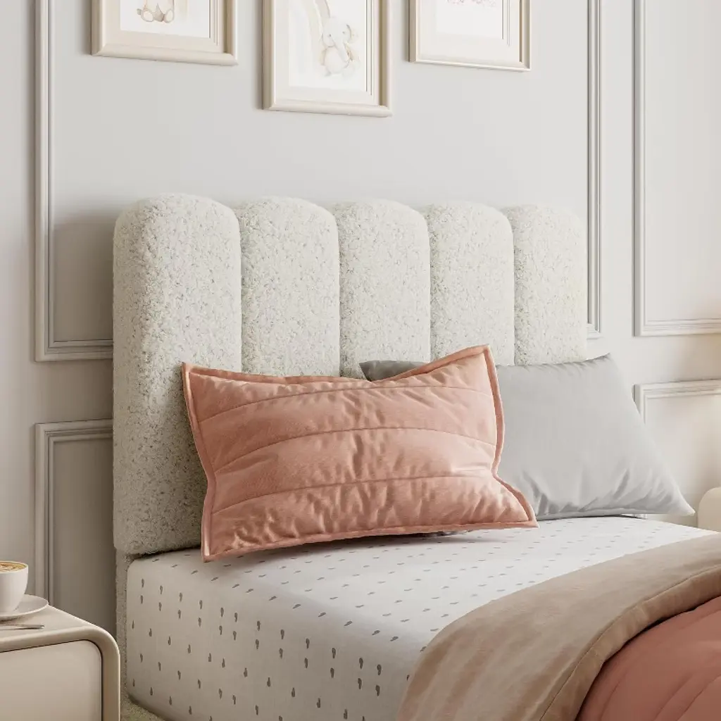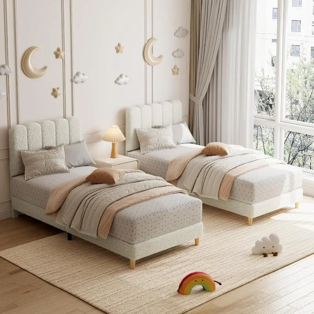 Add a playful touch to your child’s bedroom with this Twin/Twin XL boucle upholstered bed frame. Featuring a whimsical wave-shaped headboard and soft boucle fabric, it brings comfort and charm to any kids’ or teens’ room. The sturdy wooden slat system provides reliable mattress support without the need for a box spring. Designed for quiet, stable sleep, this low-profile platform bed is ideal for smaller spaces and easy to assemble with all tools included. A perfect mix of fun style and everyday function.