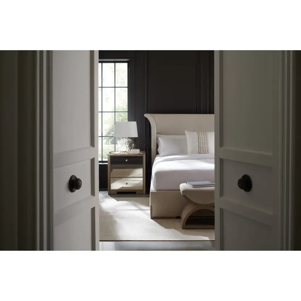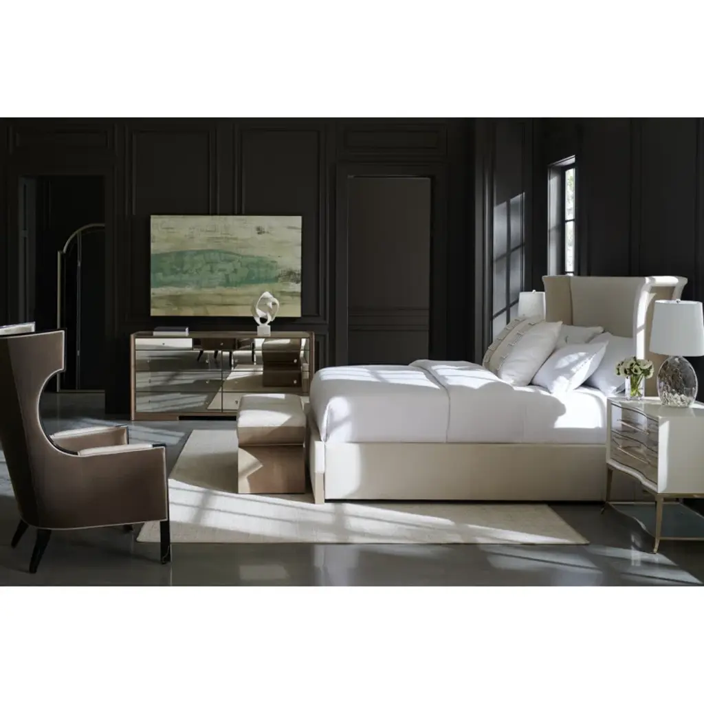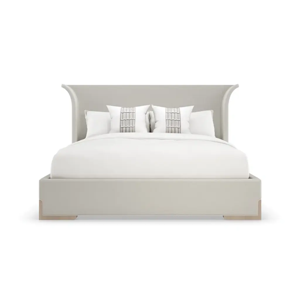 For those with a flair for the dramatic, this bed makes a captivating statement with its softly flared headboard shape. Gently arcing wings are warmly framed by inset panels crafted in Japanese Sen veneers, with matching feet seamlessly incorporated into the front rail. Fully upholstered in a shimmering performance fabric for the perfect complement to a tonal woodland gray wood finish. Brings a note of casual elegance to any bedroom interior.