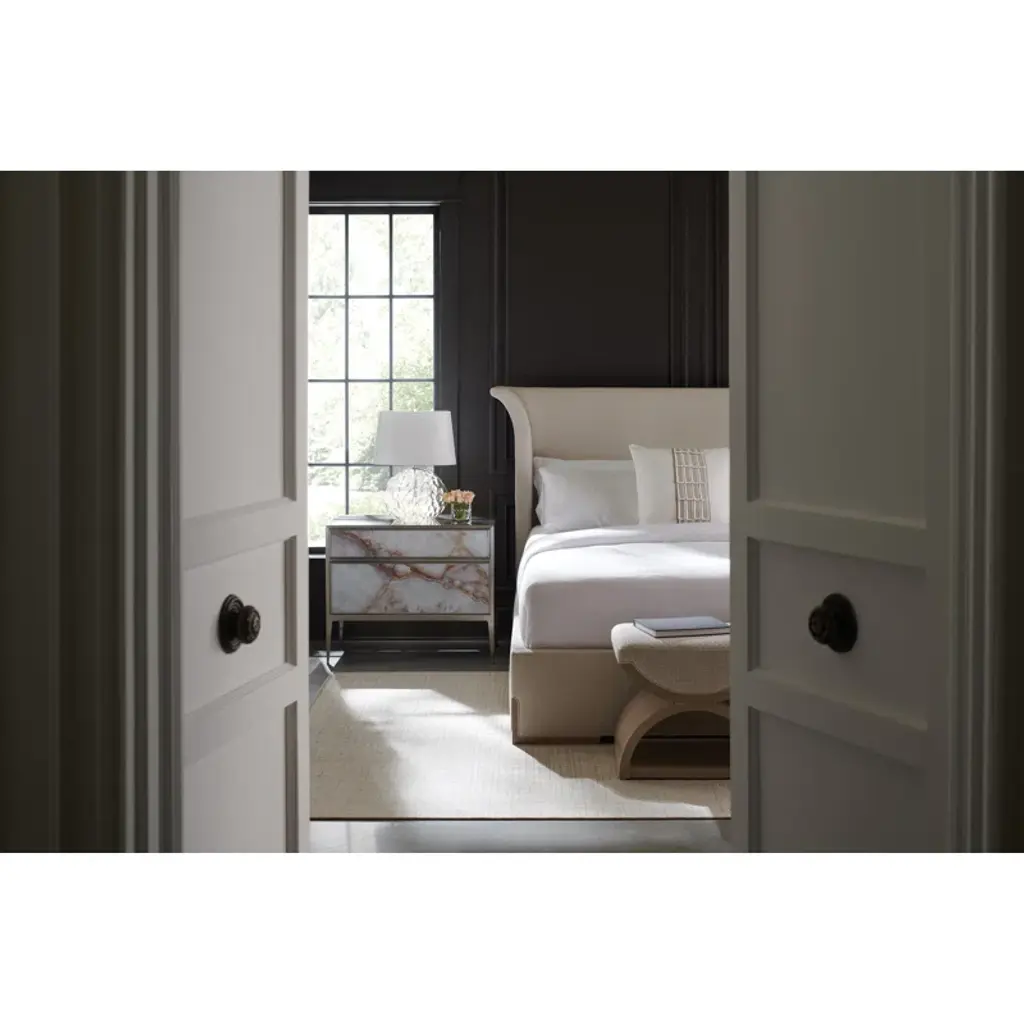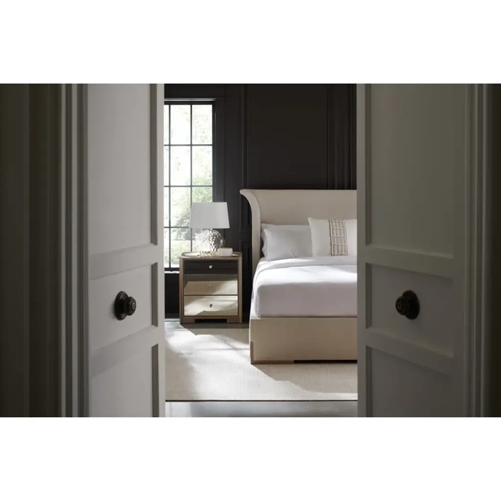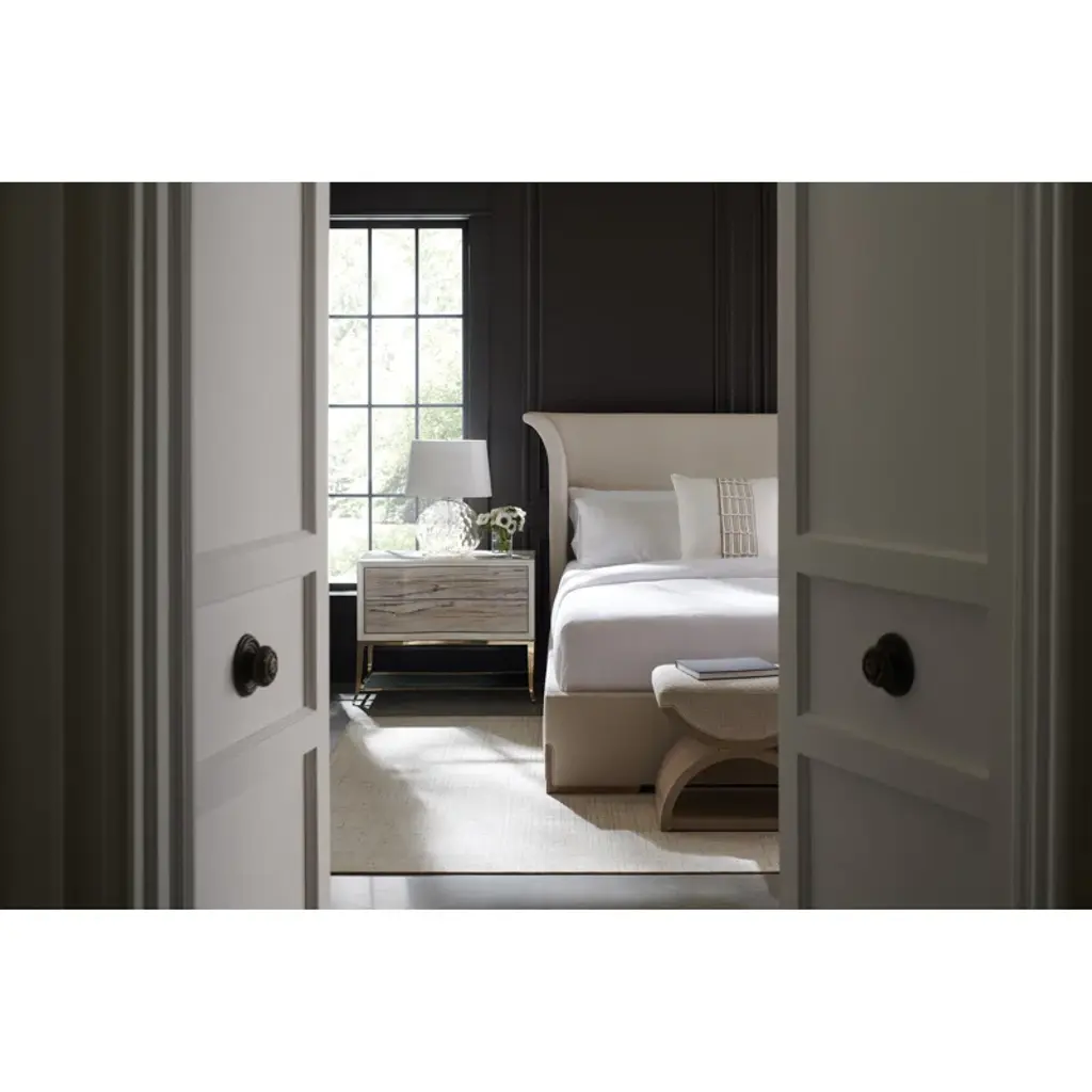 For those with a flair for the dramatic, this bed makes a captivating statement with its softly flared headboard shape. Gently arcing wings are warmly framed by inset panels crafted in Japanese Sen veneers, with matching feet seamlessly incorporated into the front rail. Fully upholstered in a shimmering performance fabric for the perfect complement to a tonal woodland gray wood finish. Brings a note of casual elegance to any bedroom interior.