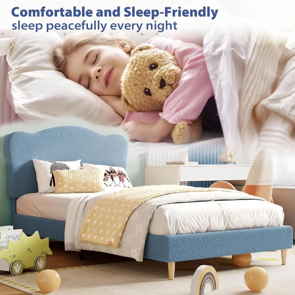 The Upholstered Bed Frame for Kids is a perfect blend of style, comfort, and durability, designed to elevate any child's bedroom. With its charming scallop headboard, this bed serves as a delightful focal point, adding a playful touch that creates an inviting atmosphere for both girls and boys. Upholstered in soft velvet, the bed not only looks fabulous but also provides a plush surface that is gentle against the skin, making it a cozy spot for rest and play. Additionally, the luxurious velvet fabric is easy to clean, ensuring that the bed maintains its vibrant appearance despite daily use. Built for stability, the sturdy platform design features wooden slats that offer excellent support, eliminating the need for a box spring and extending the lifespan of your mattress. This robust construction is ideal for active children, designed to withstand their daily adventures while ensuring a comfortable night's sleep. The bed's timeless design makes it suitable for kids of all ages, seamlessly fitting into various decor themes, whether whimsical or minimalist, allowing it to adapt as their tastes evolve. Assembly is a breeze with this bed frame, thanks to clear instructions and all necessary tools included. This user-friendly feature means parents can quickly set up the bed, transforming the room with minimal hassle. With the Upholstered Bed Frame for Kids, you invest in a beautiful, functional piece of furniture that offers comfort, durability, and style, creating the perfect sanctuary for your child to rest and dream.