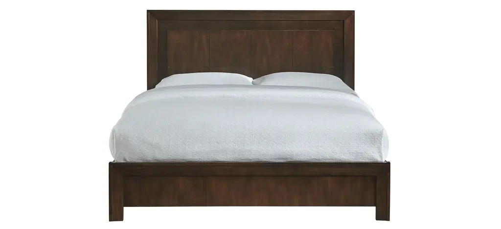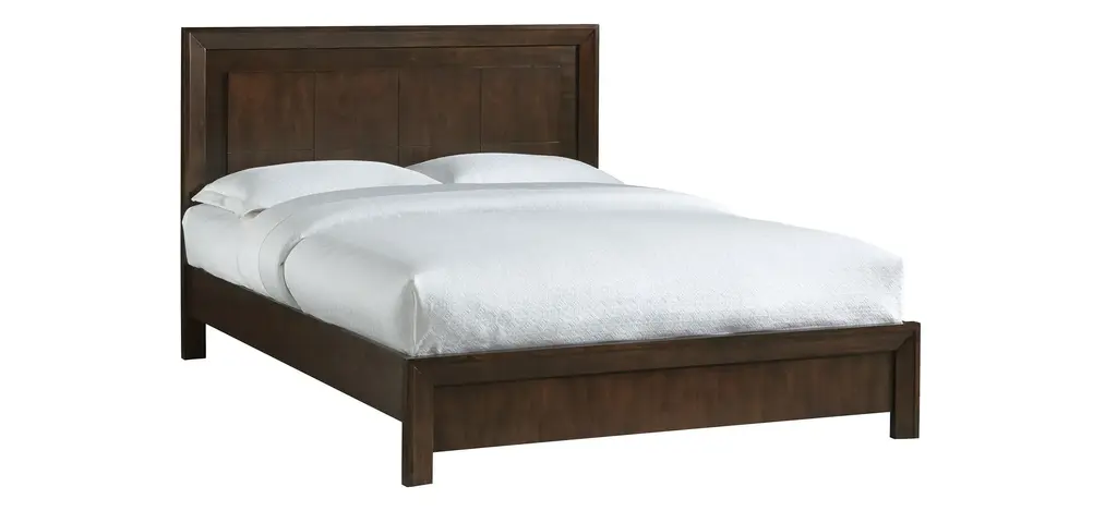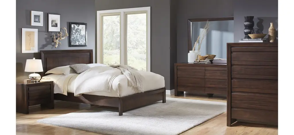 Wake up with structure with this architecturally designed contemporary collection. Thick miter-jointed outer posts are the focus as the furniture effortlessly evolves following clean lines from the top panels all the way to the floor. Tropical Mahogany solid wood and Mahogany wood veneers are finished in a dark chocolate brown featuring tones ranging from dark brown to golden brown and burgundy. Van Buren Collection is ready to define your bedroom, offering ample storage and a contemporary package.
