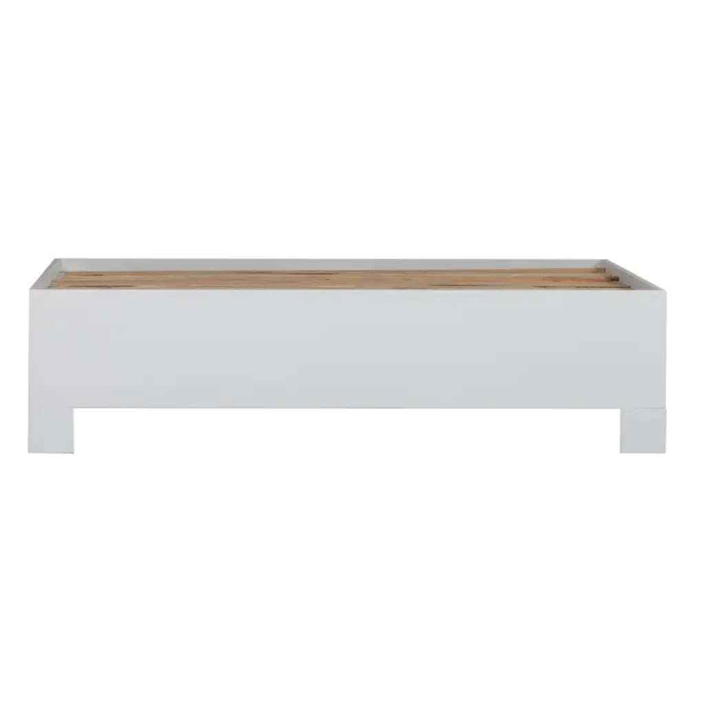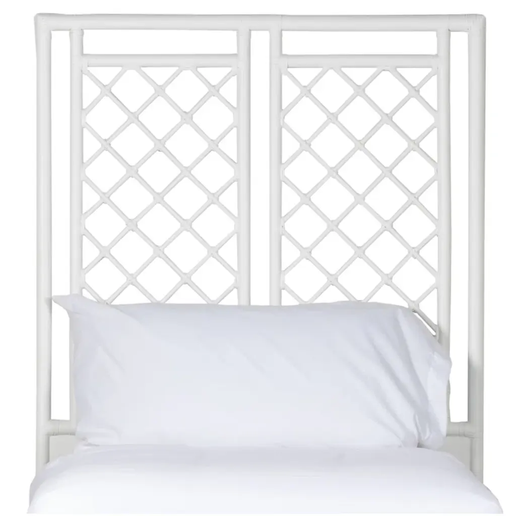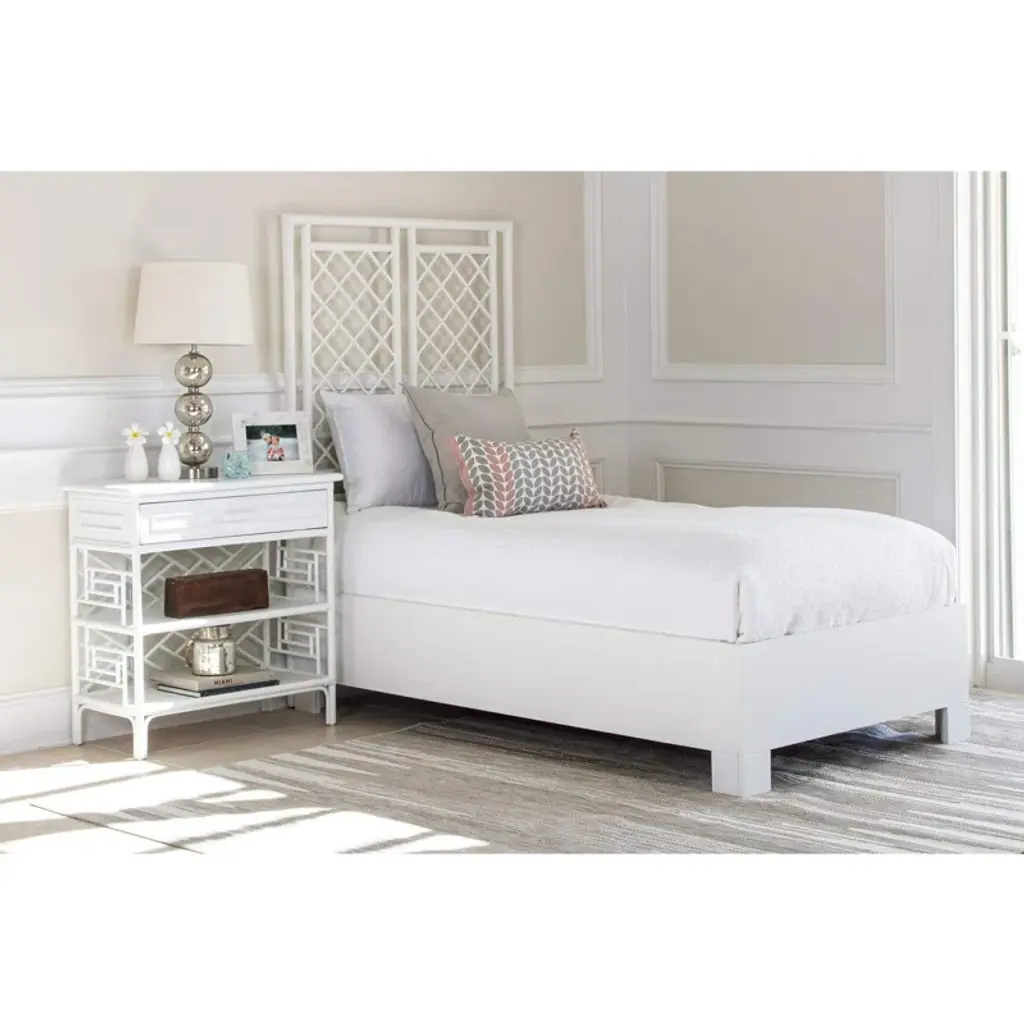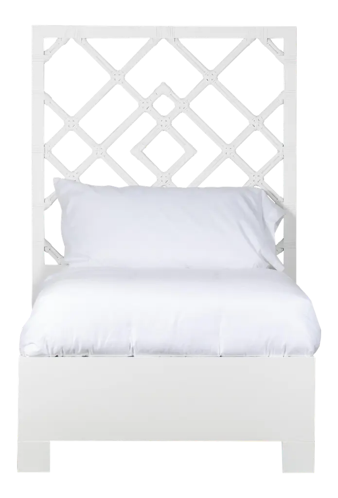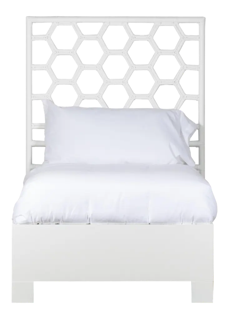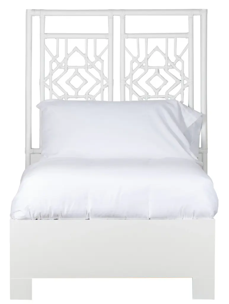 A timeless design, this geometric-styled platform bed features a rattan headboard with a maple bed frame. The rattan headboard is wrapped with rawhide bindings to add beautiful contrast and strength. The maple bed frame, which does not require a box spring, is built in the USA. The rattan headboard easily attaches to the bed frame. Each platform bed is custom-made and finished to order. This bed is available in multiple sizes and colors. This platform bed is an artistic centerpiece and will make a statement in any bedroom.