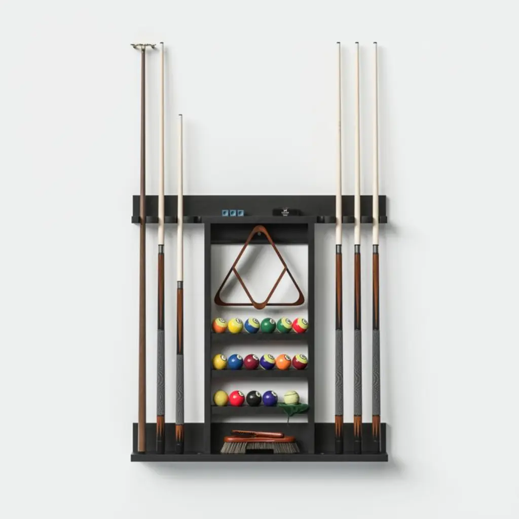 Black And Walnut Pool Table With Wall Rack And Accessories