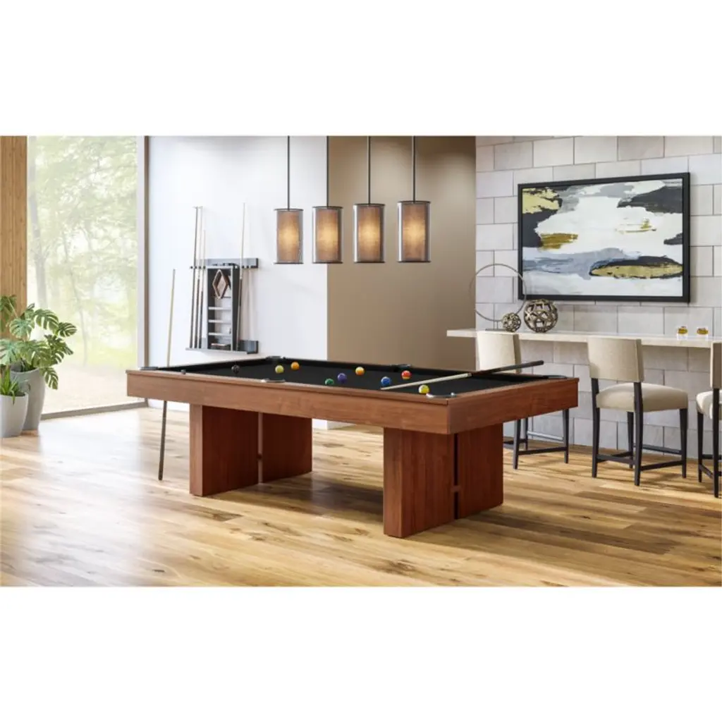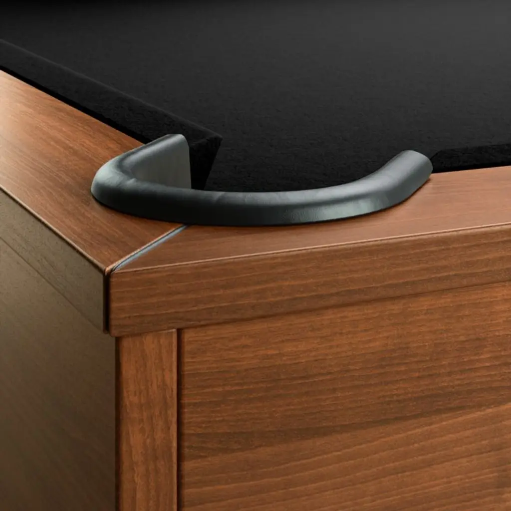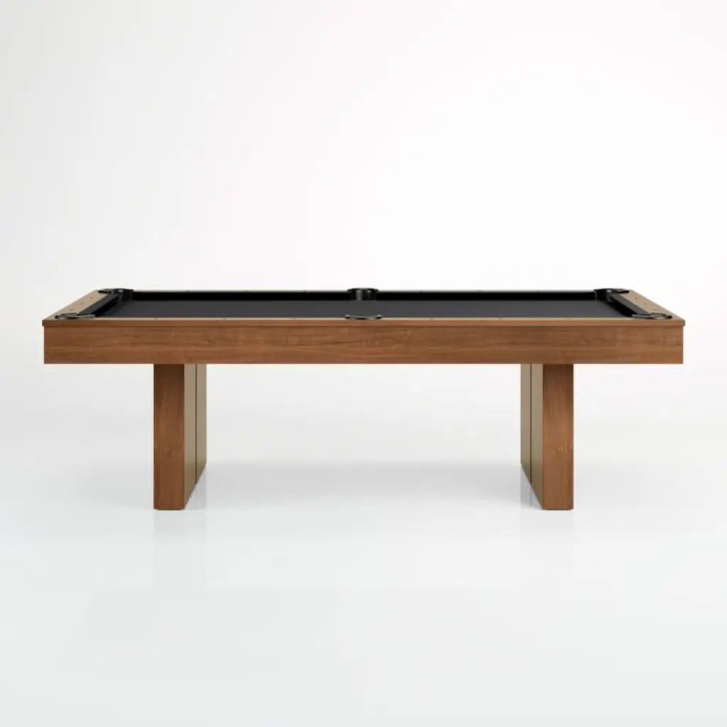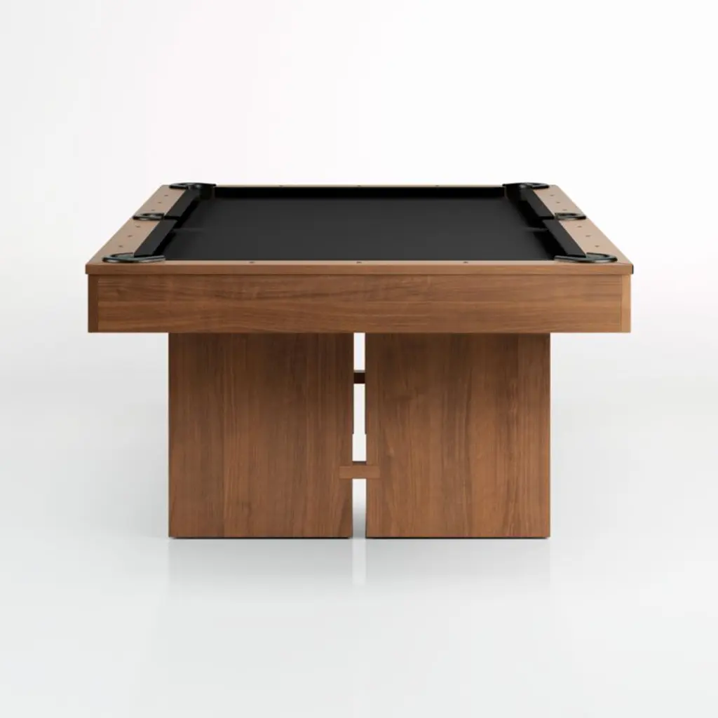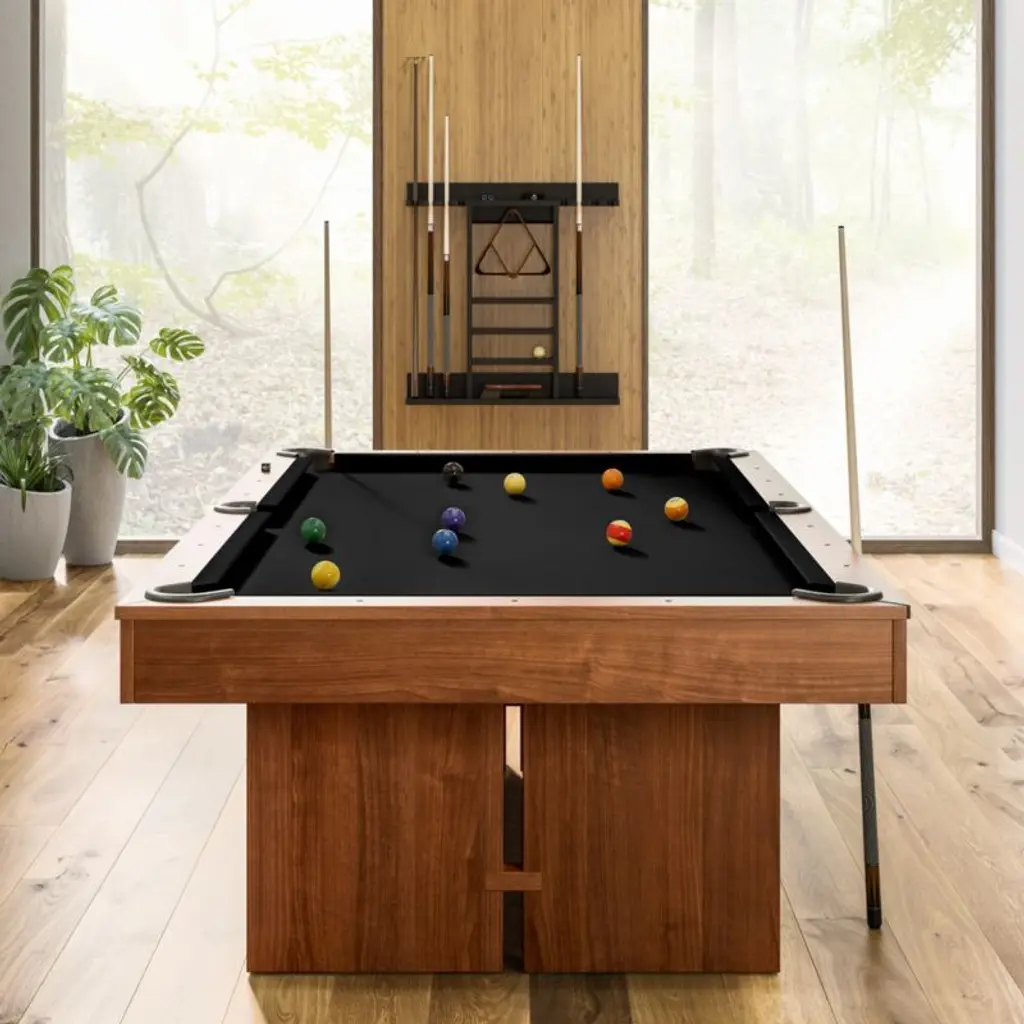 Whether eyeing an eight-ball or admiring from afar, you won't be able to take your gaze off of this stunning pool table. Made for us exclusively by Imperial USA, the table spares no detail in bringing you the ultimate game of pool in a clean, modern design you'll treasure for years. Everything's included to get the game going, including four maple cues, billiard balls, ball rack, chalk, wall rack and more. Crafted of beautifully grained black walnut with a warm honey finish, this pool table is not only visually striking, it is specially constructed to last and performmade with one-inch thick slate and oversized, interlocking beams to keep the cabinet from warping or sagging. We've covered the table in Teflon-coated black felt to protect your table from spills, and it features honey-finished black walnut rails with deep charcoal bronze sights and charcoal leather drop pockets.