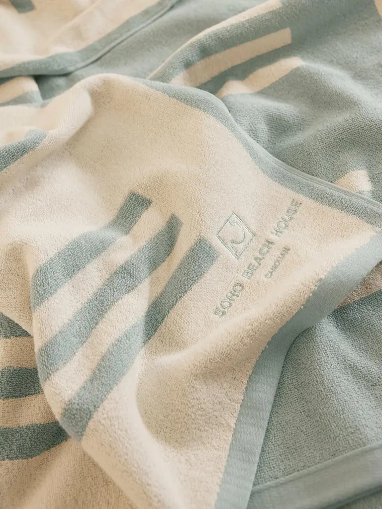 Classic cabana stripe towel used around our swimming pools Embroidered with the Canouan House logo Duck-egg blue horizontal stripes on a cream background Longlasting - tested and developed not to fade in sunlight Fluffy Turkish cotton feels excellent when sun-dried Used at Soho House Canouan