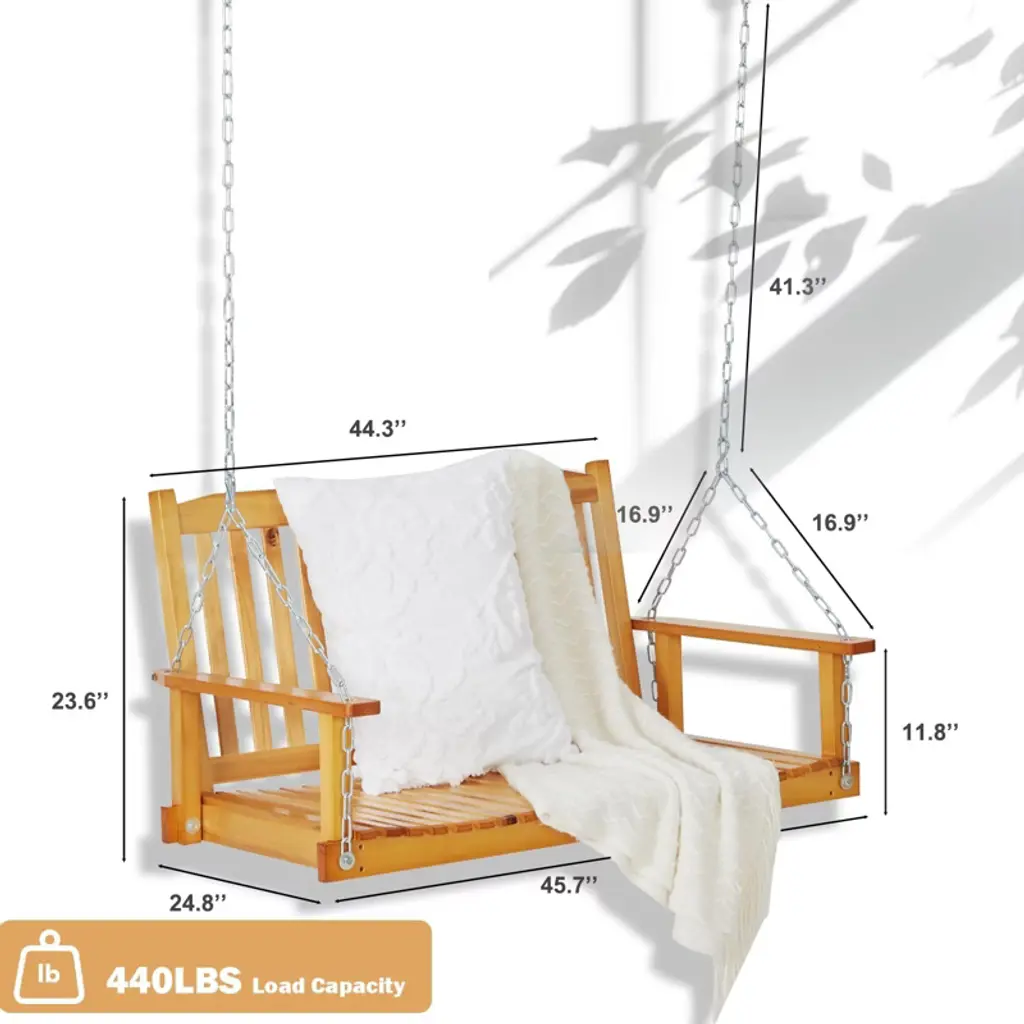 PtioHavn Premium Wooden Porch Swing - Your Perfect Outdoor Retreat!Upgrade your outdoor space with the PtioHavn 48" Solid Wood Porch Swing¡ªcrafted for durability, comfort, and timeless style. Whether you're relaxing solo or enjoying time with loved ones, this heavy-duty 440lb capacity swing is built to last.Why Choose PtioHavn?Premium Solid Wood ¨C Weather-resistant timber for long-lasting strength440lb Weight Limit ¨C Holds two adults comfortablyVersatile Use ¨C Hang on porches, pergolas, or sturdy tree branchesSpacious 4FT Seat ¨C Smooth sanded wood for splinter-free comfortEasy Setup ¨C Includes chains & hardware for quick installationPerfect For:Front porch relaxationBackyard loungingGarden or patio decorRustic farmhouse charmSpecs:Material: Solid hardwoodDimensions: 48" wideWeight Capacity: 440lbsIncluded: Chains, hardware