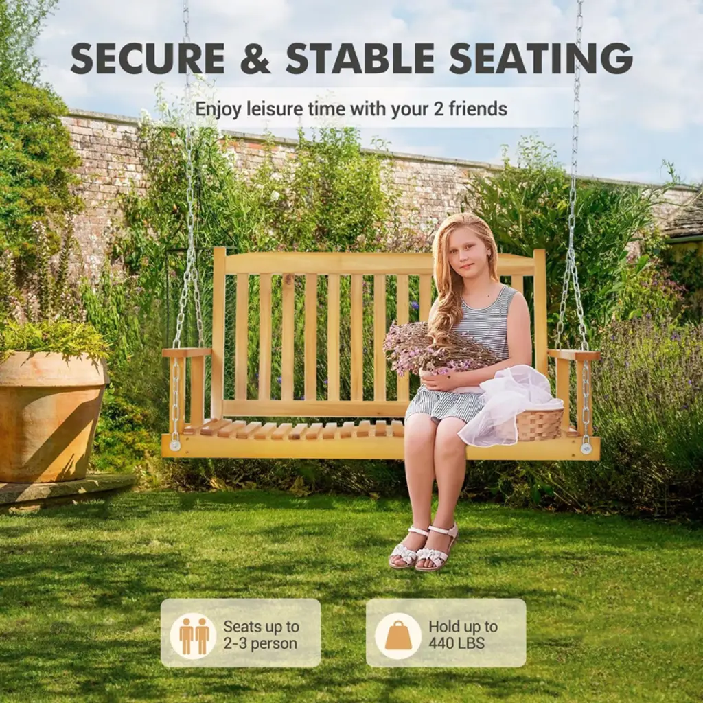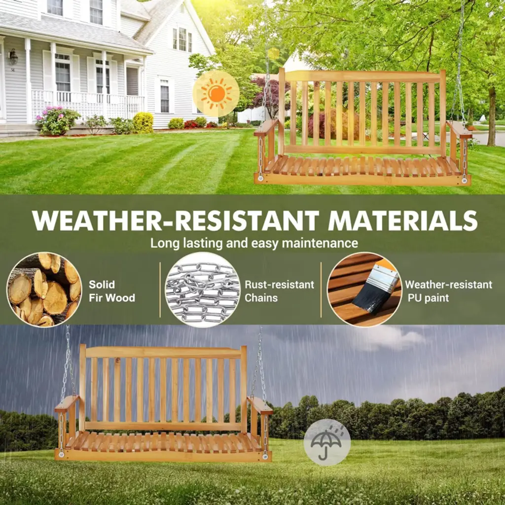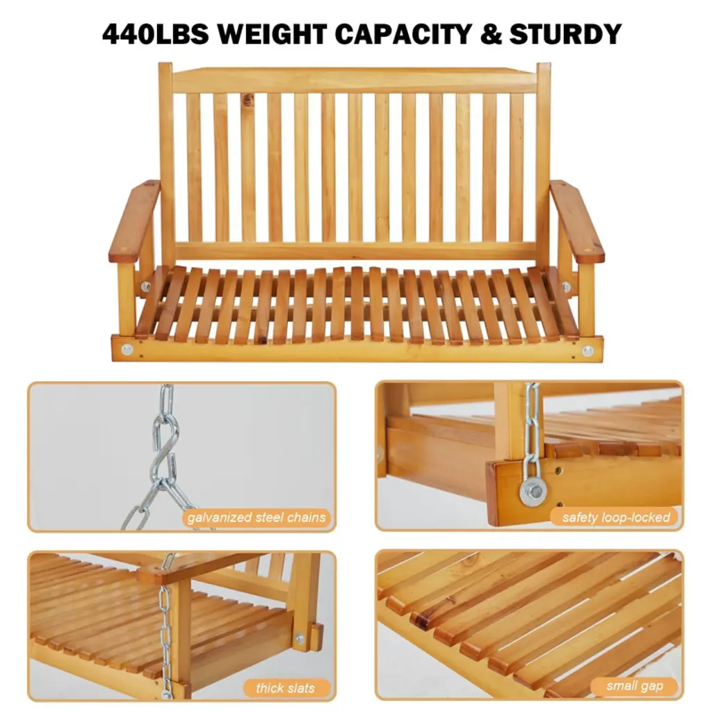 48in Heavy Duty Porch Swing - 440lb Capacity Outdoor Wooden Swing With Hanging Chains Upgraded Model, Rustic Natural Finish