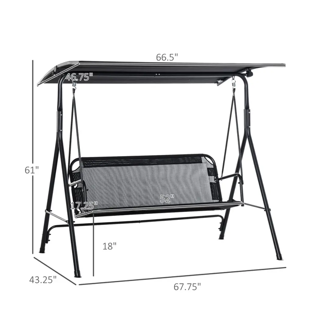The CAVINAS outdoor porch swing chair is perfect for two adults, offering a relaxing spot to enjoy sunny days with a friend. The adjustable tilting sunshade canopy keeps you cool and protected from UV rays, while the breathable polyester mesh seat dries quickly, allowing you to enjoy it even after rain. Built with durable steel and a stable "A" frame design, this swing ensures stability and comfort, with anti-slip foot pads for extra safety. Ideal for your patio, backyard, or balcony, this swing combines relaxation and style. Weight capacity: 440 lbs. Easy to assemble.