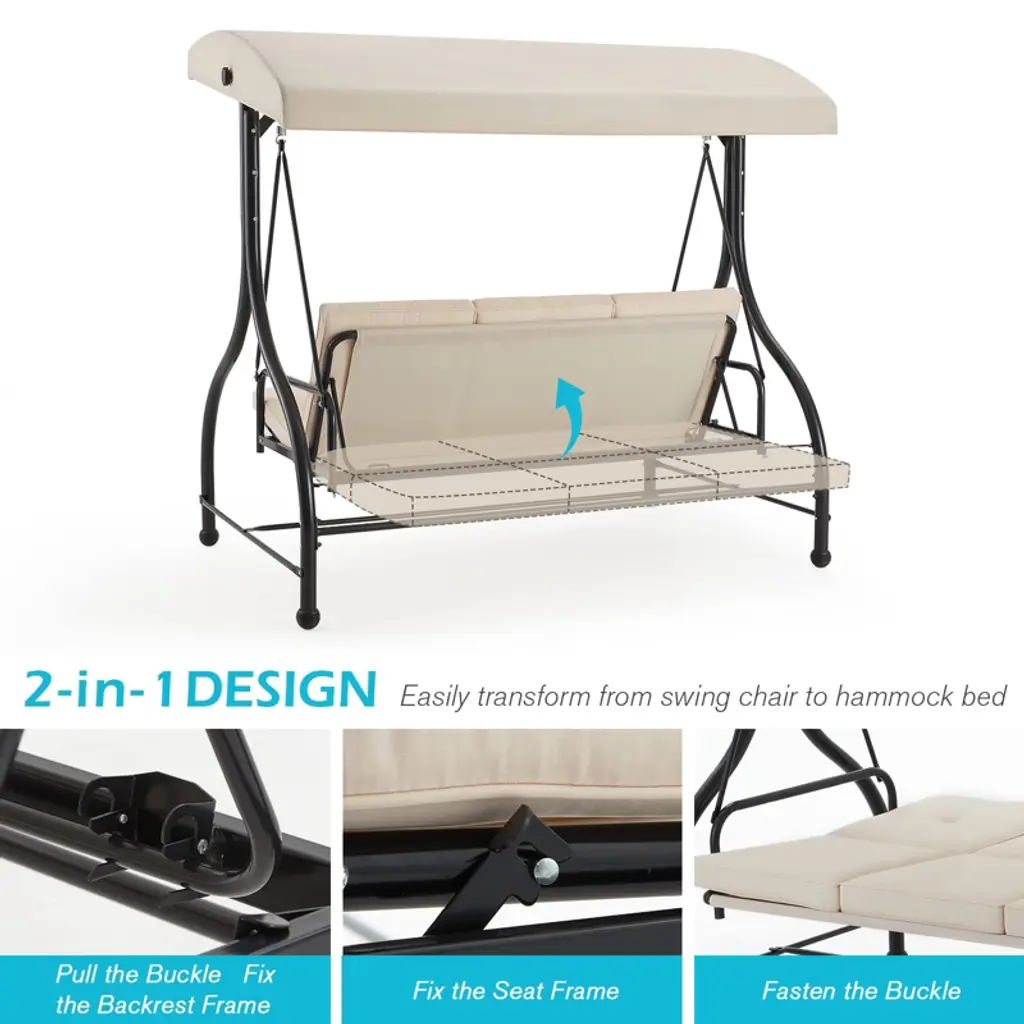 Our patio swing with a canopy offers an innovative 2 - in - 1 conversion feature. It can function as a spacious 3 - seater swing chair, perfect for socializing with family and friends. With a simple transformation, it converts into a luxurious patio swing daybed, allowing you to stretch out and relax. This versatility ensures that your outdoor experience is not only comfortable but also adaptable to different activities, making every moment spent outdoors more wonderful.
