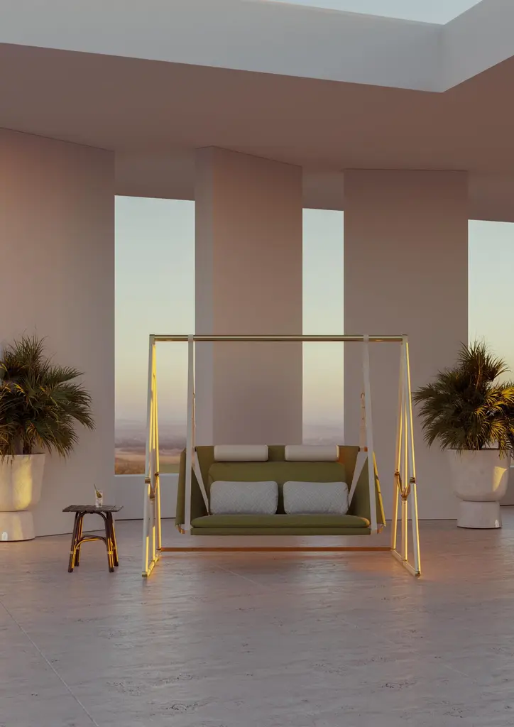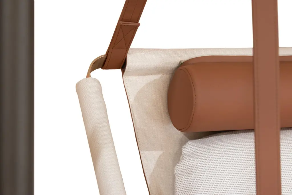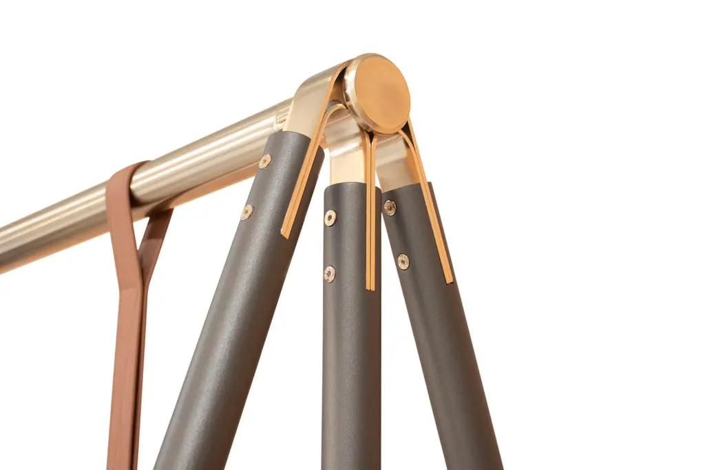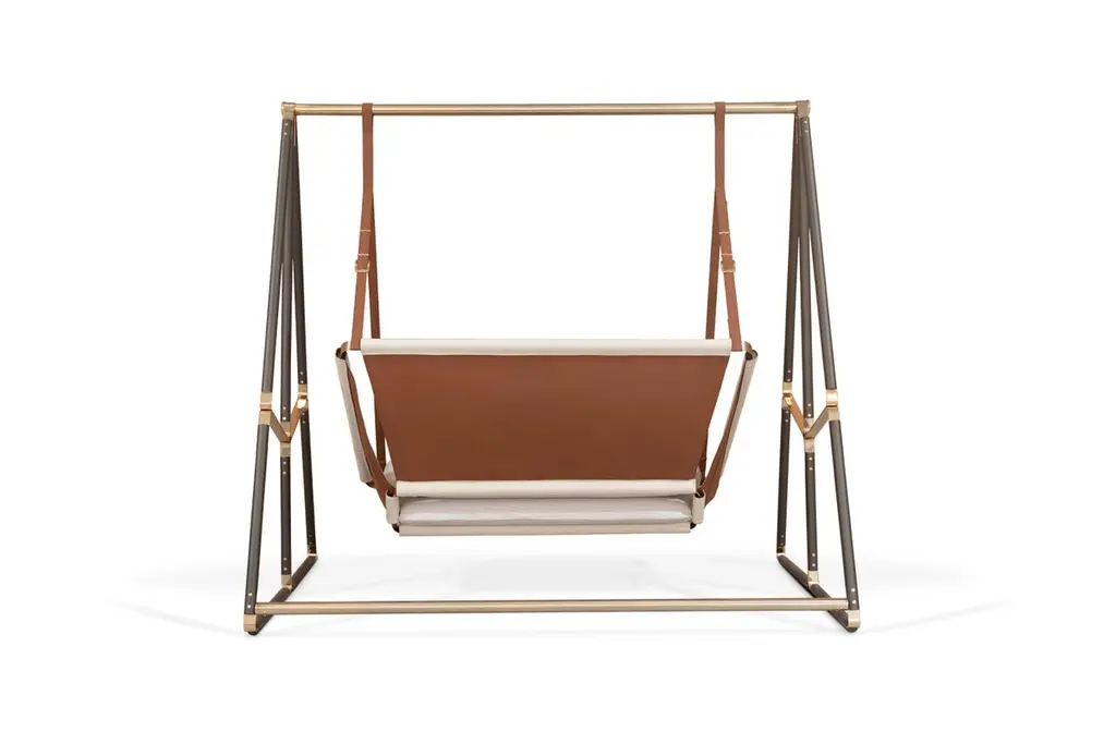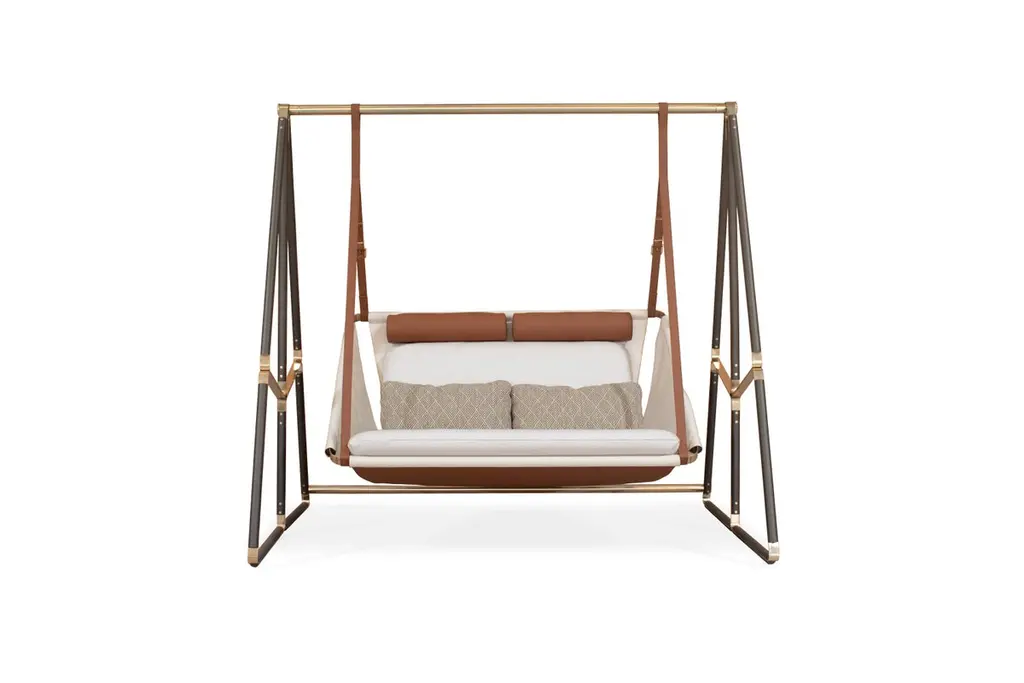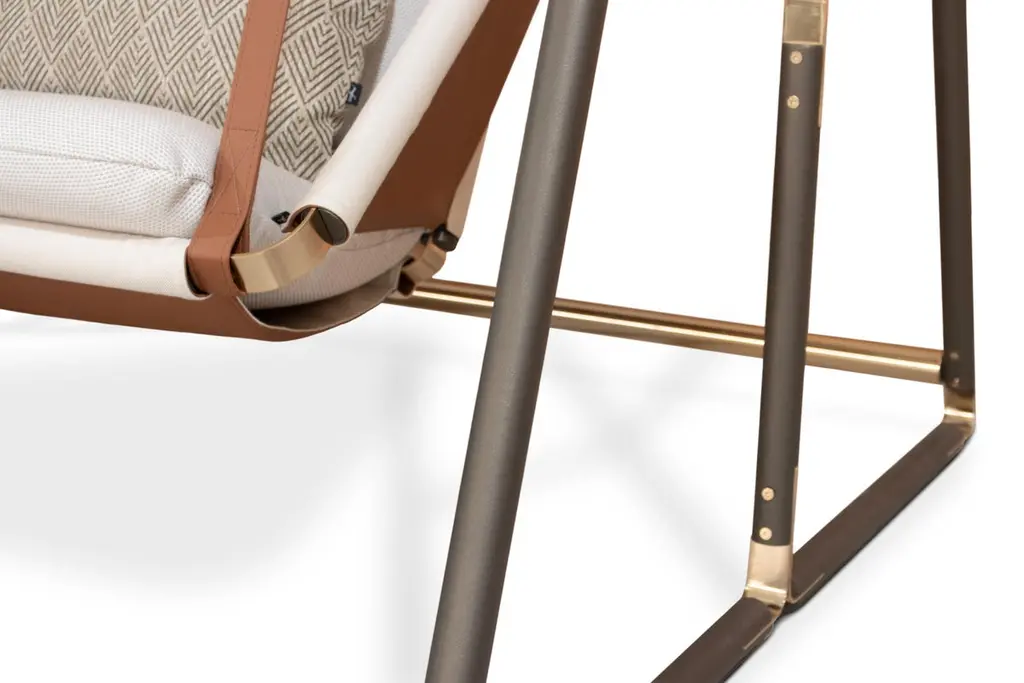 The Allure swing stands out for the combination of its outstanding materials. Plated stainless steel buckles with outdoor leather straps and premium fabrics, result on a swing with a modern design that brings the charm and elegance of the indoors to a pleasing life outdoors.The whole design of this contemporary outdoor hanging armchair with base was developed according to the following structure: - Structure: Lacquered stainless steel - Metallic Details: Plated stainless steel - Upholstery: Acrylic fabric - Straps: Outdoor Leather All Myface materials are from premium suppliers, engineered to offer the best performance possible outdoors.Water, Mold, Mildew, UV and Fading resistance are some of the characteristics that you can expect from both materials, which are available in a wide array of colors and patterns.