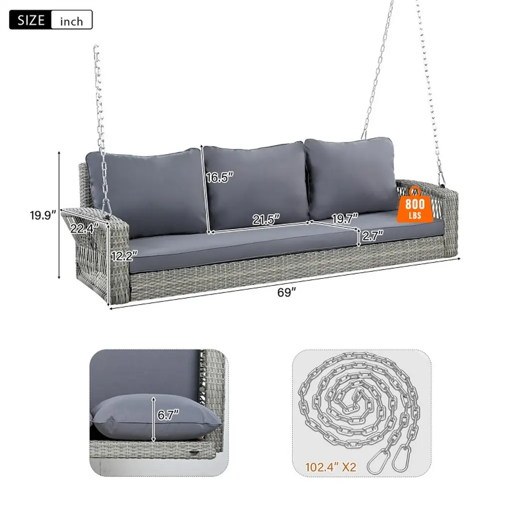 Here is our 3-Seat Rattan Porch Swing Bench with Cushions. Enveloped in hand-woven PE rattan, this swing is equipped to withstand the elements with ease. The breathable polyester covers are water repellent, guaranteeing that the swing will last for years. No matter winter or summer, wicker seat won't be too cold or hot due to the temperature. Extra wide seat is suitable for 3 person and 2.7 inch thick cushion is pretty soft for long time seating. No worry about the capacity, it can hold up to 800LBS. Enjoy the fun time with your family, friends or lover!