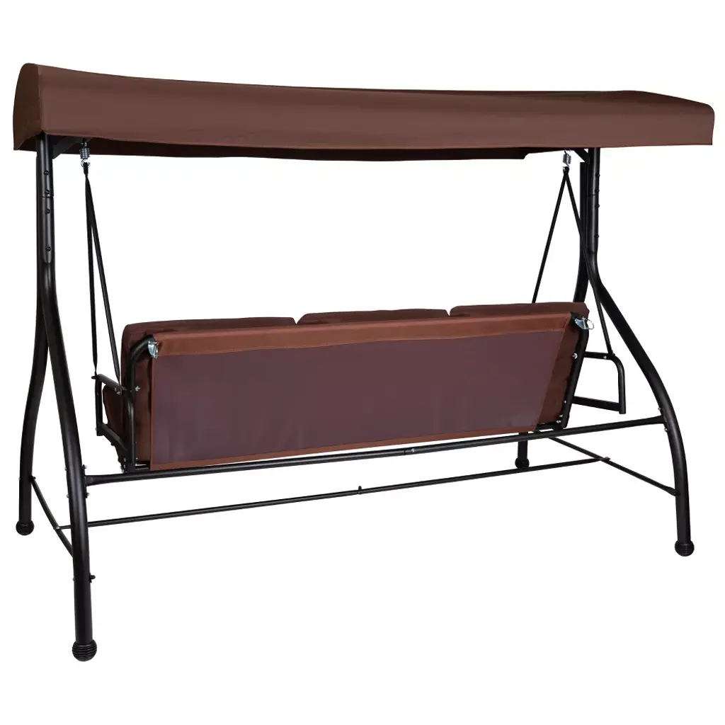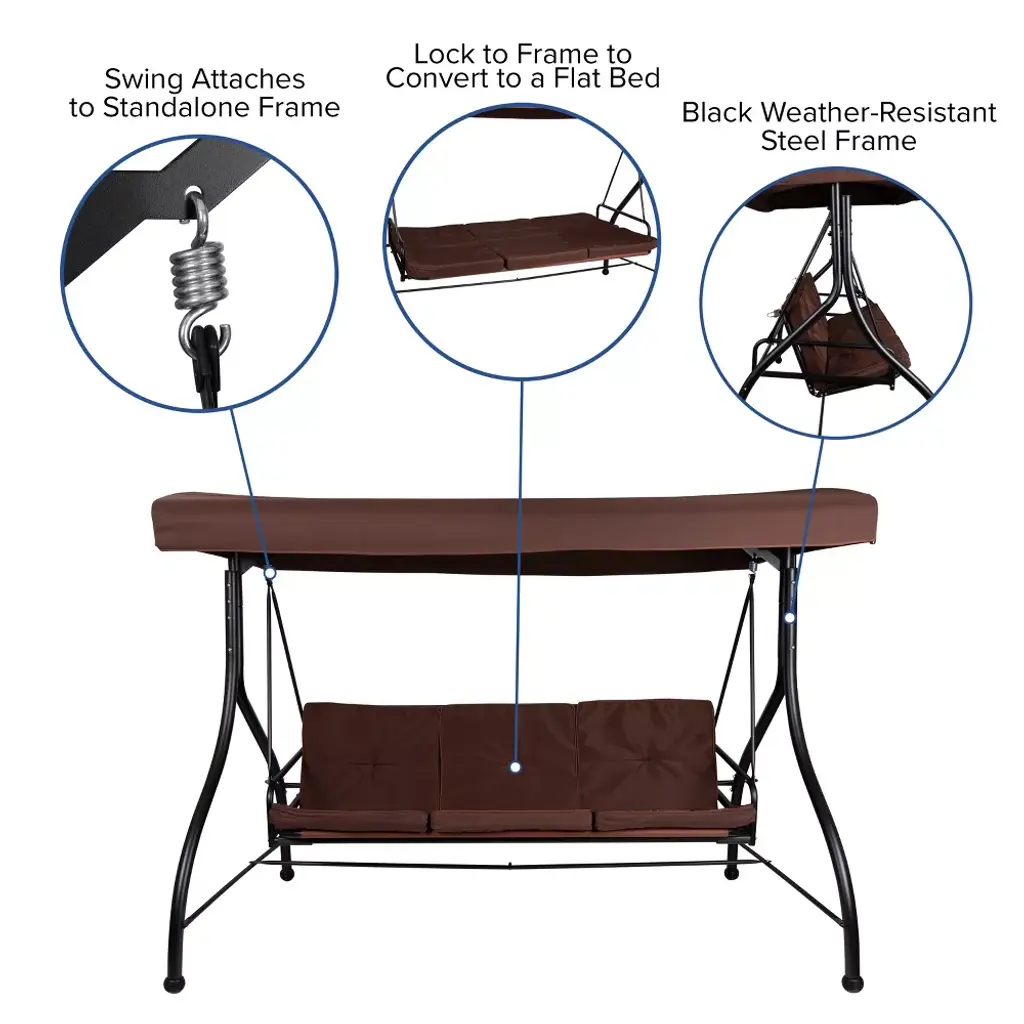 Take some time to unwind with a cool drink and let the rhythmic motion of this covered patio swing lull you into relaxation. An adjustable polyester canopy will allow you to decide how much sunlight you receive while the removeable back and seat cushions will keep you comfortable. If you feel like hanging out with friends and family, the quality steel frame is capable of holding up to 800 pounds and will comfortably seat up to 3 adults. Are you ready for some alone time? Curl up with a good book or recline the back and attach it to the frame to make a flat bed for an afternoon nap in the fresh air. The rich brown fabric of the canopy and cushions pairs nicely with the black frame finish and the two neutrals complement each other to create a sophisticated look for your outdoor space. Fixed plastic floor glides will allow the set to move easily and the polyester material is easily cleaned with a water based cleaner for easy maintenance. Reduce stress and make the most of your evenings and weekends with this patio porch swing that is sure to become your go-to seat. Additional Features: Convertible Flat Bed - back reclines and locks to frame prohibiting swinging motion once locked, Fold-Down Bed Size: 68"W x 40.5"D x 2"H, Weather-Resistant Steel Frame with Plastic Floor Glides, Use a water based cleaner to remove dirt, Ideal for poolside, backyard and patio entertaining