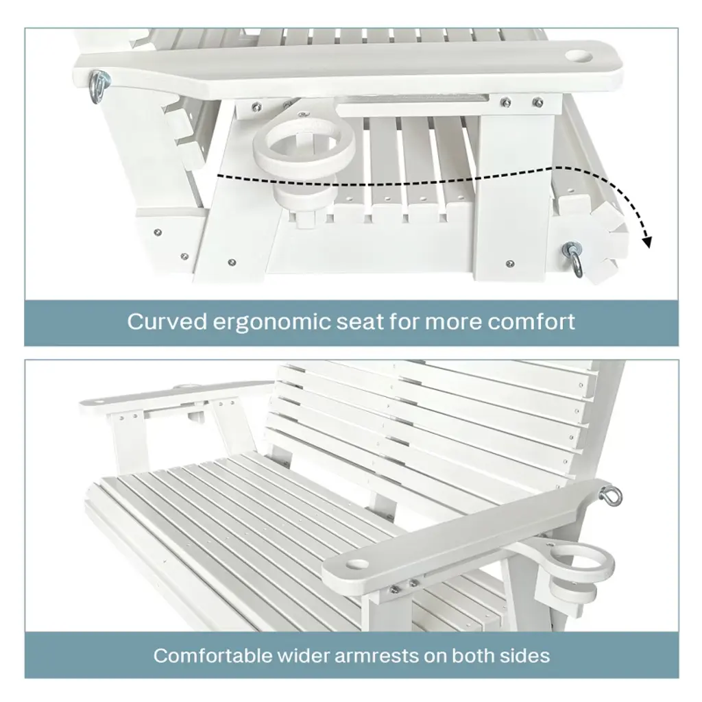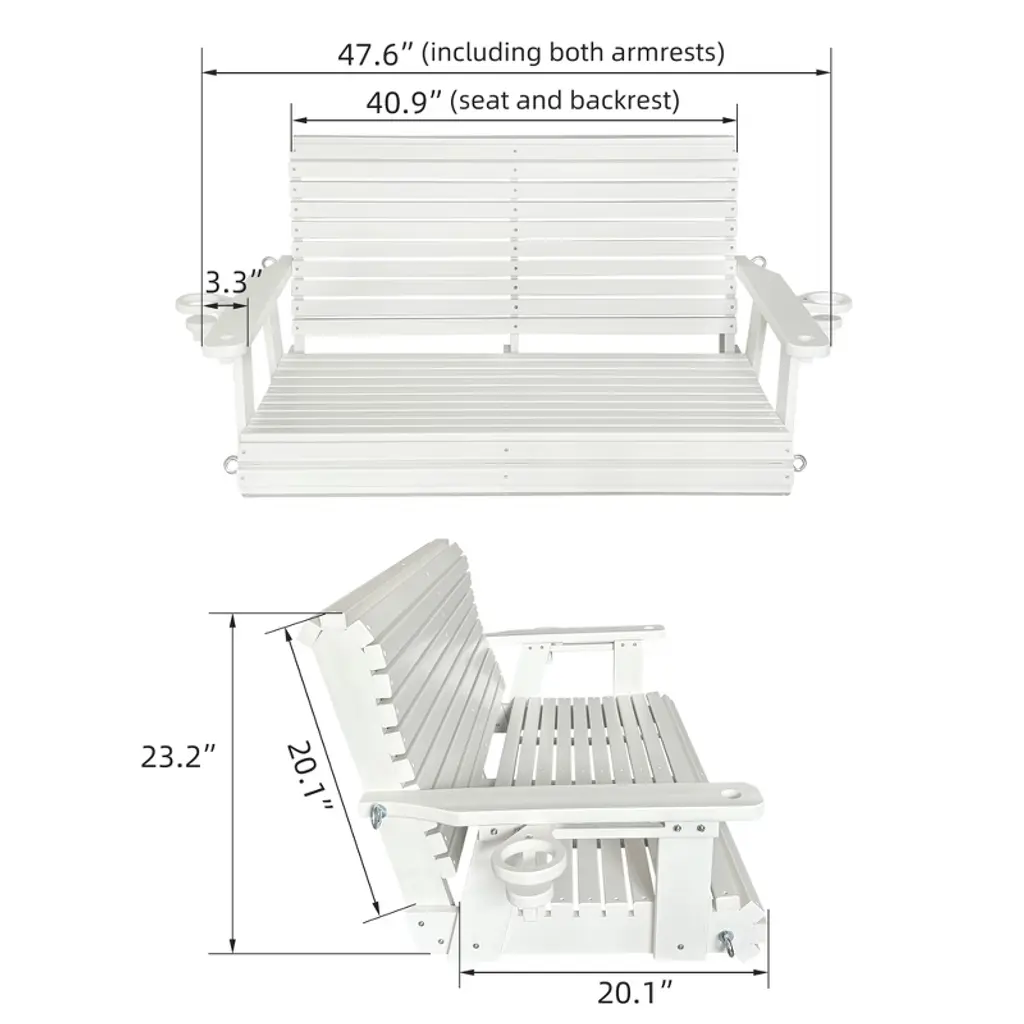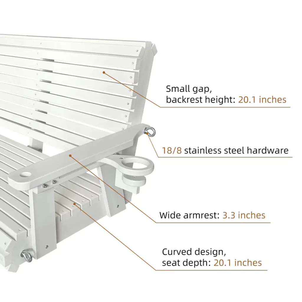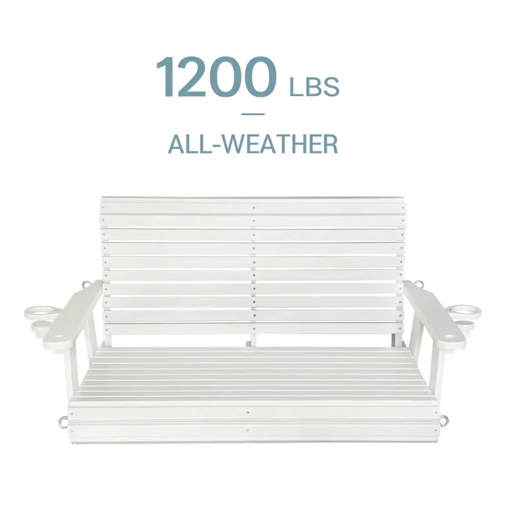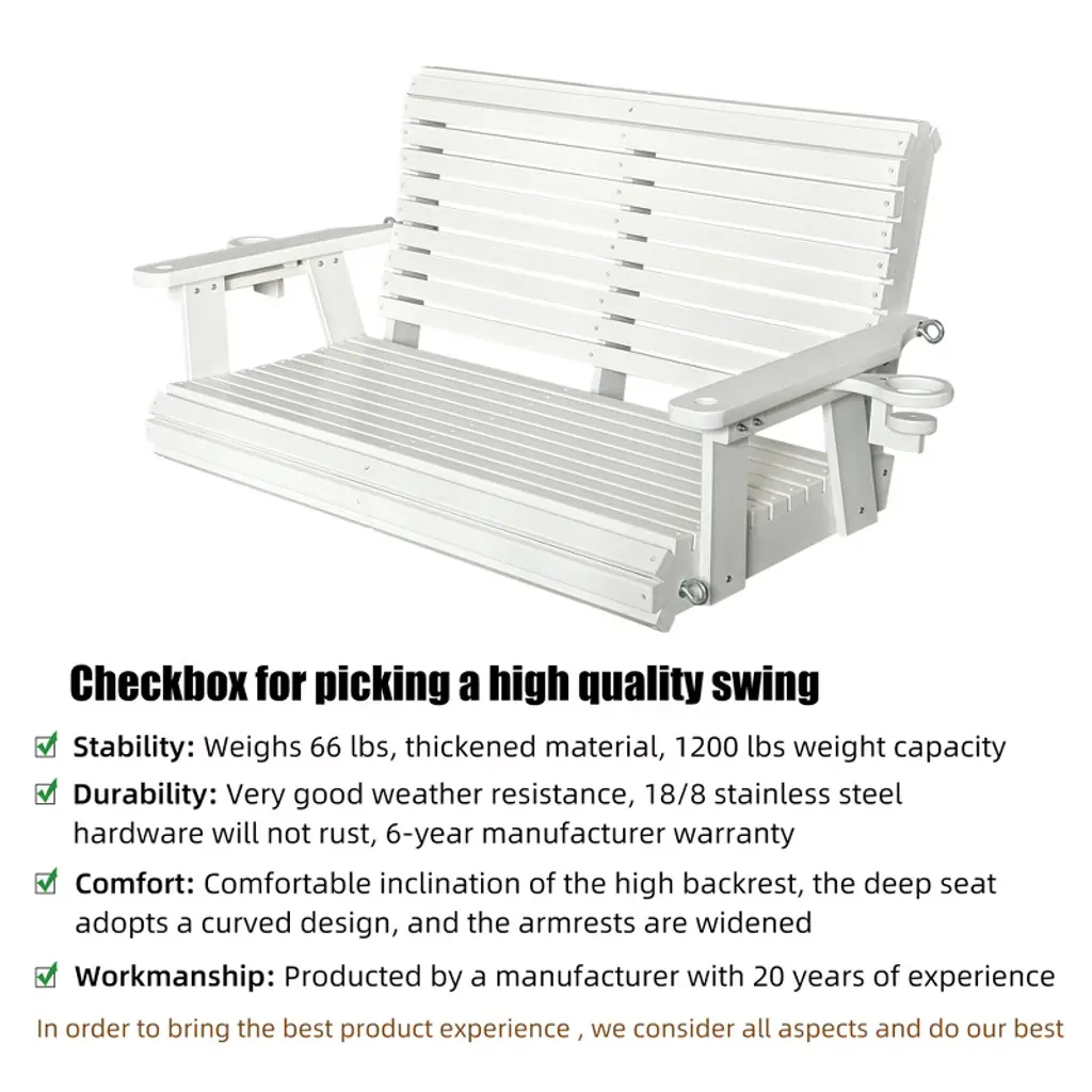 ๐๐ฑ๐๐๐ฅ๐ฅ๐๐ง๐ญ ๐๐๐๐ญ๐ก๐๐ซ ๐๐๐ฌ๐ข๐ฌ๐ญ๐๐ง๐๐ & ๐๐ฎ๐ซ๐๐๐ข๐ฅ๐ข๐ญ๐ฒ: Made of HDPE (High-Density Polyethylene); will not crack, peel, or rot when exposed to the elements; great for outdoor use ๐๐จ๐ฅ๐ข๐ ๐๐ง๐ ๐๐ญ๐๐๐ฅ๐: Weighs 66 LBS, thickened material, 1200 lbs weight capacity; much easier maintenance compared to wooden swings ๐๐ซ๐ ๐จ๐ง๐จ๐ฆ๐ข๐ ๐๐๐ฌ๐ข๐ ๐ง: Rollback design contours to your body; the high backrest and deep seat perfectly support your back and thighs, bringing more comfort than small size products; it is recommended to use this swing with a pillow ๐๐ฎ๐๐ฅ๐ข๐ญ๐ฒ ๐๐ซ๐จ๐๐ฎ๐๐ญ: Made by experienced and mature craftsmanship; for your comfort and safety, our slats are extra-thick and have no sharp edges; the 18/8 stainless steel screws and chains will not rust ๐๐ข๐ฆ๐๐ง๐ฌ๐ข๐จ๐ง๐ฌ: The seat size is 40.9''W x 20.1''D; The backrest height is 20.1''; the seat is wide enough for two people to sit intimately ๐๐๐ฌ๐ฒ ๐ญ๐จ ๐๐ฌ๐ฌ๐๐ฆ๐๐ฅ๐: Ships partially assembled; follow the step-by-step instructions to assemble effortlessly in 30 minutes ๐๐ซ๐๐๐ญ ๐๐๐ซ๐ฏ๐ข๐๐: Our after-sales service is appreciated by many buyers; if you find parts damaged during transportation, please send a message to us for partial refund or replacement parts ๐๐๐๐ค๐๐ ๐ ๐๐ง๐๐ฅ๐ฎ๐๐๐ฌ: 4ft. porch swing, two sets of 5mm 18/8 stainless steel hanging chains, 18/8 stainless steel hardware, all tools for assembly, A4-size instruction manual