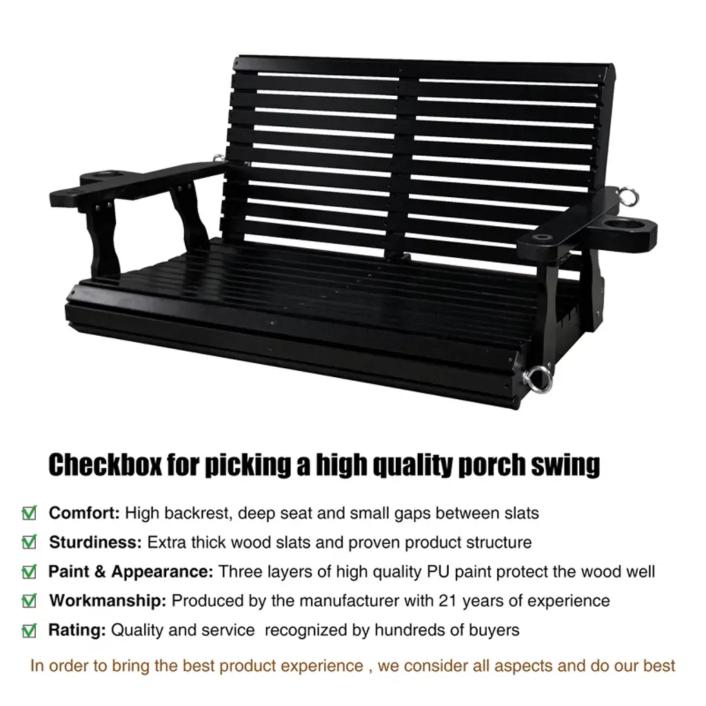 ๐๐จ๐ณ๐ฒ ๐๐ฉ๐จ๐ญ: A porch swing could be a cherished part of homes, create lasting memories for families; it provides a soothing place to relax, enjoy a breeze, read a book, or sip a drink; if you need a comfortable and sturdy swing to enjoy gathering or relaxation, this product could be your choice; so many buyers have verified its design and quality ๐๐๐ฌ๐ข๐ ๐ง๐๐ ๐๐จ๐ซ ๐๐จ๐ฆ๐๐จ๐ซ๐ญ: Rollback design contours to your body; the high backrest and deep seat perfectly support your back and thighs, bringing more comfort than small size products; the gap between the wooden slats is so small that you can barely feel it when you sit on it ๐๐ฎ๐ซ๐ฌ๐ฎ๐ข๐ญ ๐จ๐ ๐๐ญ๐ฎ๐ซ๐๐ข๐ง๐๐ฌ๐ฌ: Made of dried solid fir wood, which is tough and durable; made by experienced and mature craftsmanship; slats are extra-thick and have no sharp edges; can hold 880 pounds in our test ๐๐๐๐ญ๐ก๐๐ซ ๐๐๐ฌ๐ข๐ฌ๐ญ๐๐ง๐ญ: All sides are finished in high-quality PU wood paint for complete protection; the coated screws and chains will not rust ๐๐๐ฌ๐ฒ ๐ญ๐จ ๐๐ฌ๐ฌ๐๐ฆ๐๐ฅ๐: Ships partially assembled; clear instructions on the A4-size user manual; tools and assembly video are available ๐๐จ๐ง๐ฎ๐ฌ: Two cup holders added to both sides don't take up space in the seat; it comes with two large spring hooks for reducing shocks ๐๐ฑ๐๐๐ฅ๐ฅ๐๐ง๐ญ ๐๐๐ซ๐ฏ๐ข๐๐: Our after-sales service is appreciated by many buyers; if you find parts damaged during transportation, please send a message to us for partial refund or replacement parts