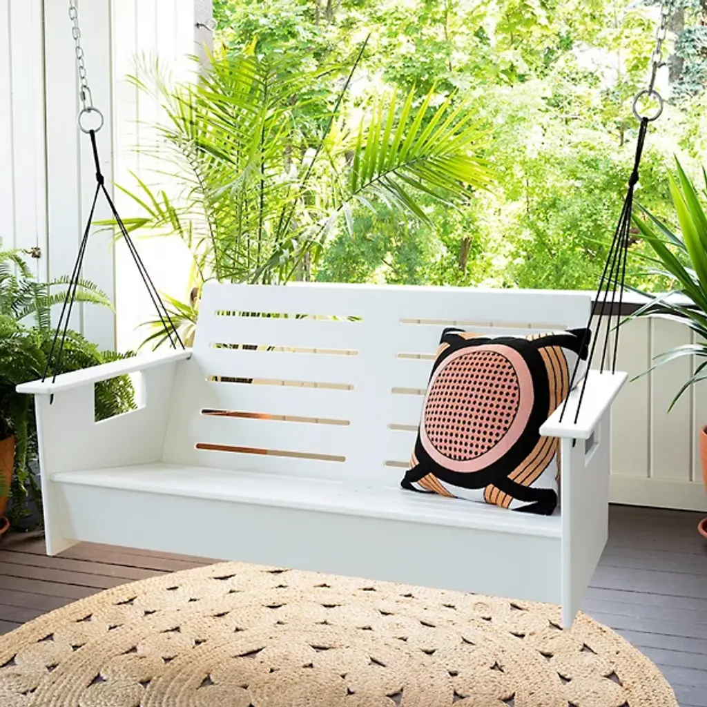Country comfort gets a contemporary upgrade in the GO Outdoor Porch Swing by Loll. Sitting down and standing up is almost effortless thanks to a taller seat height and more upright back than usual, while the porch swing's durable design provides years of cozy enjoyment. A charming addition to a front porch or covered back deck, this weatherproof swing can be left outdoors year-round and comes in multiple color options to accommodate any décor.