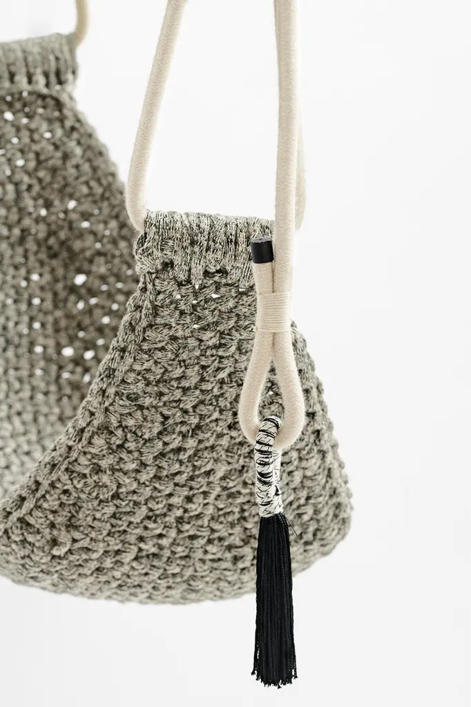 The IOTA Saddle Swings are lightweight and compact. They are good for enjoying the outdoors and kids love them too. You can easily take the hammock like swing with you to hang during camping trips. The swings are handmade from a signature yarn designed and produced exclusively by IOTA with UV protection therefore perfect for a sophisticated resort style look indoors or outdoors. The seat of the saddle swing is made entirely of crochet, which has a natural tendency to stretch. The seat can initially be a little tight and with use stretches and takes the shape of the body.In addition to being a contemporary design studio iota soft living is a social project that employs, teaches and empowers women who are otherwise unable to work by teaching them the crochet technique and providing them work which they can carry out from their homes.Seat Dimensions: 30 x 60 cm / 12 x 24 inBack Dimensions: 52 x 11 cm / 20 x 4 inThe seat of the saddle swing is made entirely of crochet, which has a natural tendency to stretch. The seat can initially be a little tight and with use stretches and takes the shape of the body.Height – The swings are made for a ceiling height of 285cm / 9'4". 2 Cabled swings can be adjusted manually 15cm / 5.9" higher or lower. 4 Cabled swings are not adjustable and therefore need to be made by order of height. We don't make longer swings but for ceilings higher than 285cm / 9'4" we provide 4mm cables.Maintenance - Remove dust regularly with a vacuum cleaner. The use of chemical cleaning materials may harm the product. Try to address stains before they dry, with a moist cloth. During off-season, keep your outdoor furniture stored in a cool, ventilated, and dry place, indoors. If the furniture must remain outdoors, it’s best for it to be under a roof and placed on a dry surface to prevent water damage from below. After rainfall or harsh weather conditions, make sure to wipe off excess moisture or water from all flat surfaces. Products may vary up to 5% as objects are handmade.