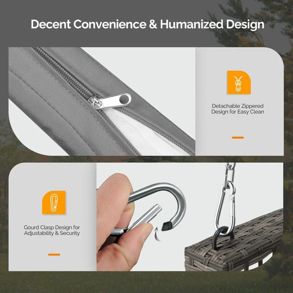Discover comfort and style with the 2-Person Wicker Hanging Porch Swing, a perfect addition to any outdoor space. Designed to blend seamlessly with your garden, porch, or backyard setting, this swing bench offers a tranquil retreat for you and your loved one. With its sturdy construction and plush cushions, it provides both safety and a luxurious sitting experience. The swing's grey color and rattan design add a contemporary touch to any exterior decor, inviting you to sit back, relax, and enjoy the serene outdoors.
