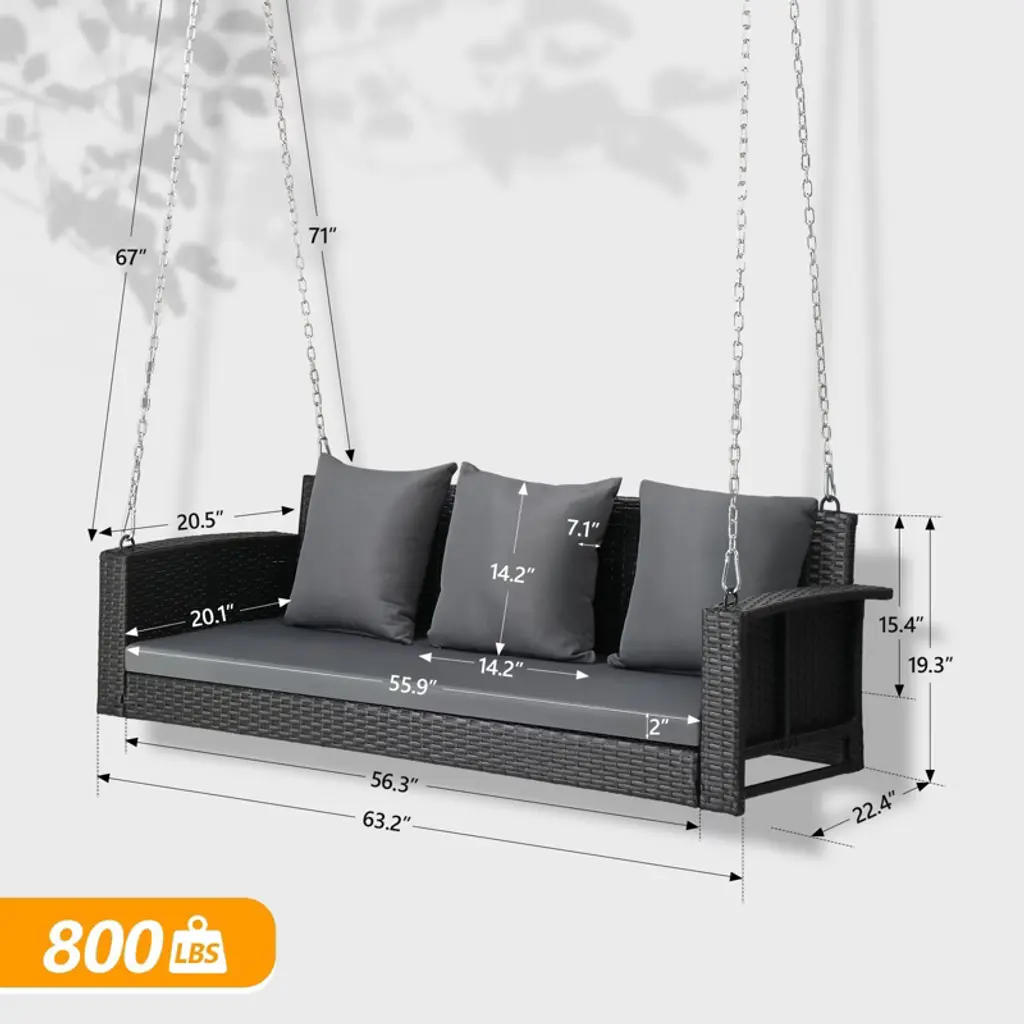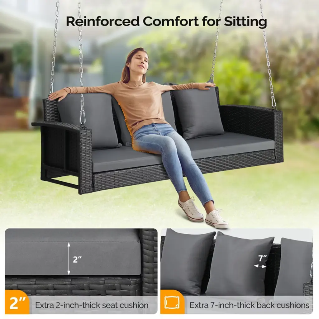 Immerse yourself in the ultimate relaxation with our wicker hanging porch swing. This outdoor rattan swing lounge is a fusion of elegance and comfort, designed to enhance any porch, backyard, lawn, or garden. Suitable for two or three, it's the perfect spot to enjoy a peaceful afternoon with a gentle sway. The robust frame, combined with plush cushions, provides a cozy nook for reading, sipping your favorite beverage, or simply soaking in the serenity of your outdoor haven.