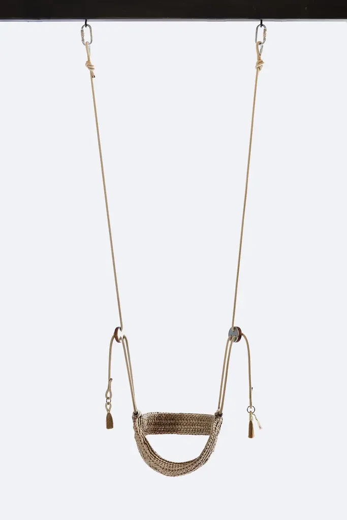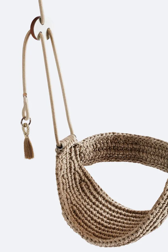 The IOTA Saddle Swings are lightweight and compact. They are good for enjoying the outdoors and kids love them too. You can easily take the hammock like swing with you to hang during camping trips. The swings are handmade from a signature yarn designed and produced exclusively by IOTA with UV protection therefore perfect for a sophisticated resort style look indoors or outdoors. The seat of the saddle swing is made entirely of crochet, which has a natural tendency to stretch. The seat can initially be a little tight and with use stretches and takes the shape of the body.In addition to being a contemporary design studio iota soft living is a social project that employs, teaches and empowers women who are otherwise unable to work by teaching them the crochet technique and providing them work which they can carry out from their homes.Seat Dimensions: 30 x 60 cm / 12 x 24 inBack Dimensions: 52 x 11 cm / 20 x 4 inThe seat of the saddle swing is made entirely of crochet, which has a natural tendency to stretch. The seat can initially be a little tight and with use stretches and takes the shape of the body.Height – The swings are made for a ceiling height of 285cm / 9'4". 2 Cabled swings can be adjusted manually 15cm / 5.9" higher or lower. 4 Cabled swings are not adjustable and therefore need to be made by order of height. We don't make longer swings but for ceilings higher than 285cm / 9'4" we provide 4mm cables.Maintenance - Remove dust regularly with a vacuum cleaner. The use of chemical cleaning materials may harm the product. Try to address stains before they dry, with a moist cloth. During off-season, keep your outdoor furniture stored in a cool, ventilated, and dry place, indoors. If the furniture must remain outdoors, it’s best for it to be under a roof and placed on a dry surface to prevent water damage from below. After rainfall or harsh weather conditions, make sure to wipe off excess moisture or water from all flat surfaces. Products may vary up to 5% as objects are handmade.