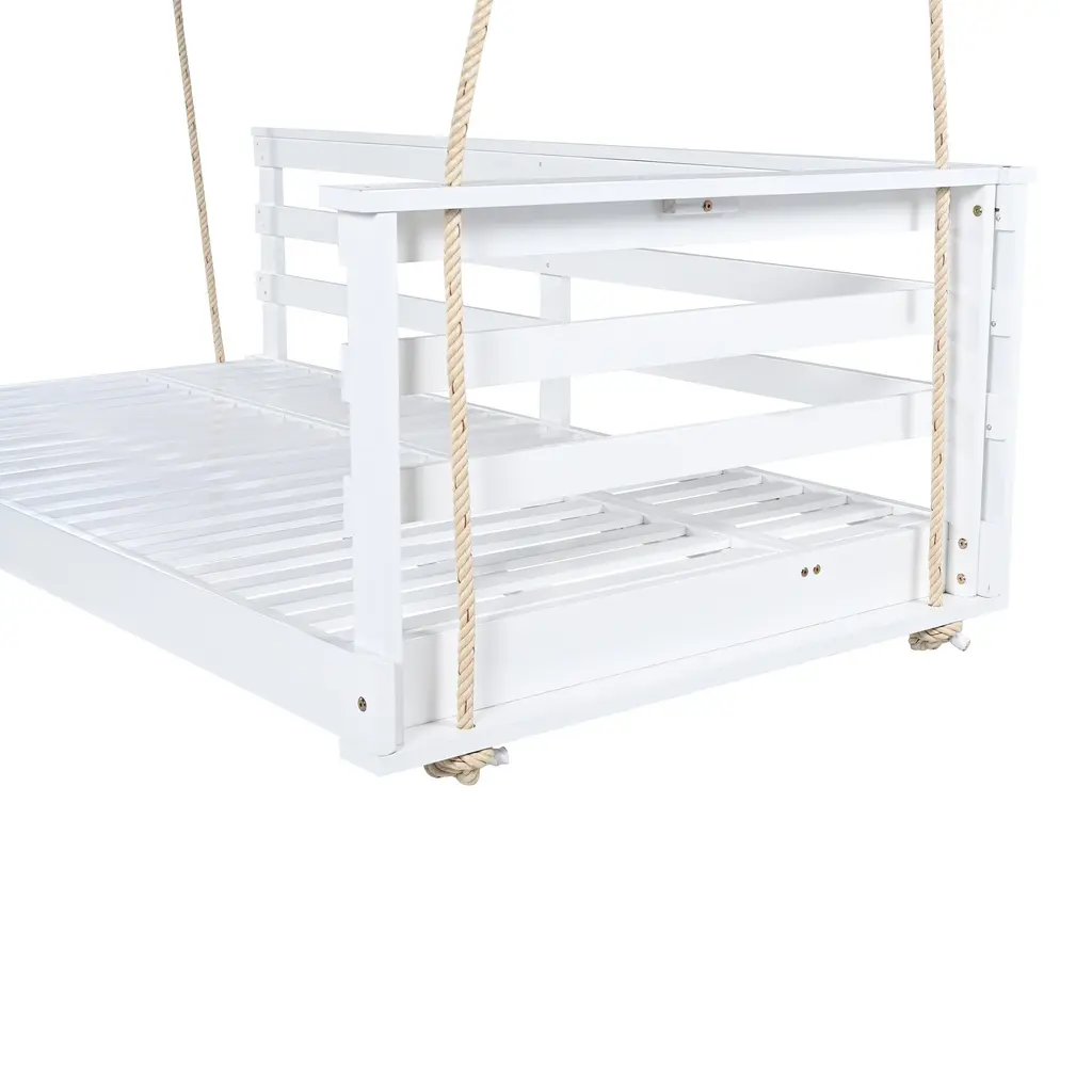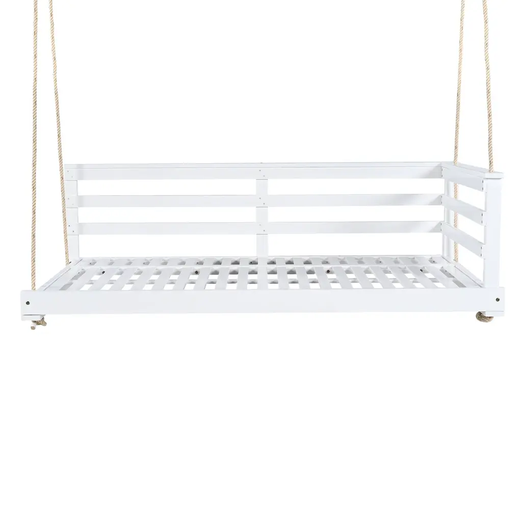 [Durable Acacia Wood& Sturdy Construction]Crafted from high-quality acacia wood, this swing bed is built to withstand outdoor elements while offering a stylish, natural look. The sturdy design ensures long-lasting durability, making it a perfect addition to your garden, patio, or porch.[Comfortable Twin Size for Relaxation] Designed with a spacious twin-size bed, this swing provides plenty of room to stretch out and relax. Whether you're lounging, reading, or taking a nap, its generous size offers the comfort you need for outdoor relaxation. Standard twin size mattress will be suitable.[Strong Hemp ropes for Secure Hanging]The swing is supported by four 96-inch hemp ropes, offering both strength and stability. With a 350lbs weight capacity, these eco-friendly ropes ensure safety and peace of mind while you enjoy the swing bed's comfort.[Minimalist Design with Open-Side Rail]Featuring a minimalist country style, this swing bed complements various outdoor décors. The open-side rail design provides easy access from both sides, adding convenience and functionality to your outdoor space without compromising on style.