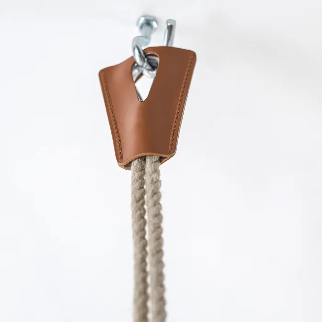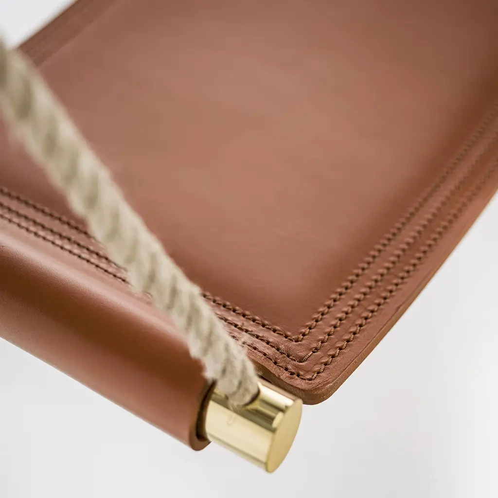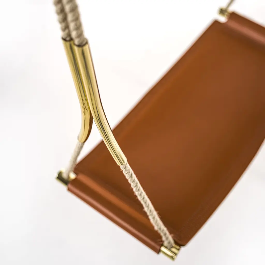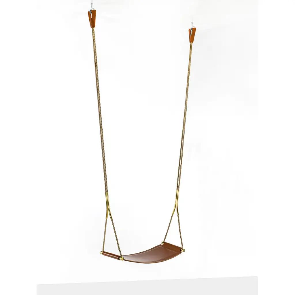 This indoor swing will add a sophisticated and playful accent to a modern loft with its brown leather seat embellished by tone-on-tone stitching. Suspended from an adjustable rope, this swing features polished bronzed brass hardware that adds a stylish element to its classic design revisited with a modern flair. Please contact the Concierge for other available leather colors. Can hold up to 750kg.