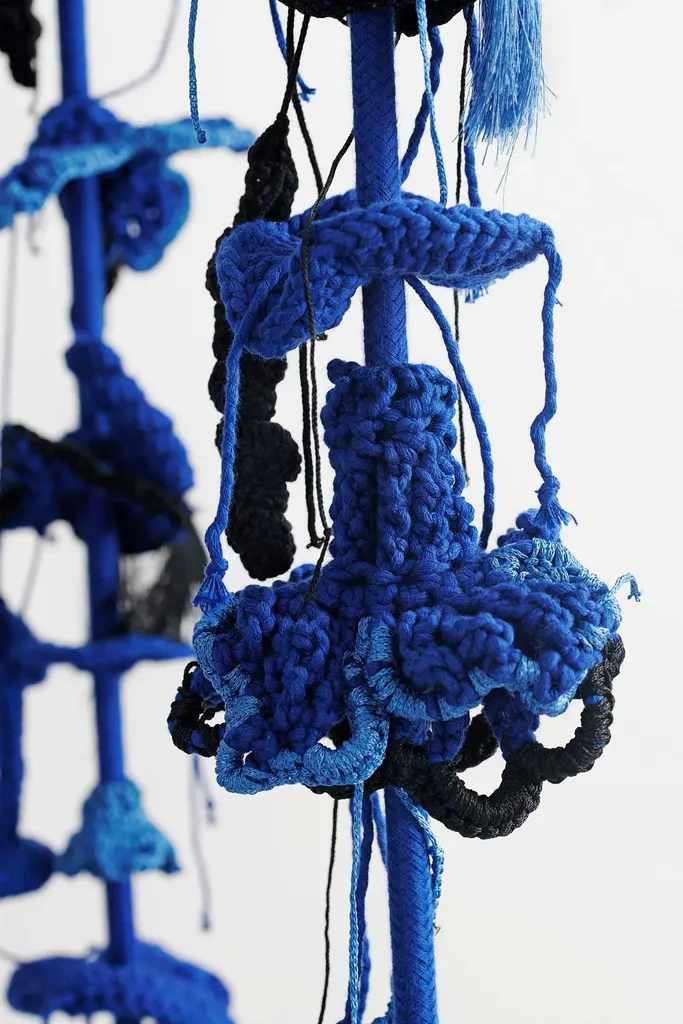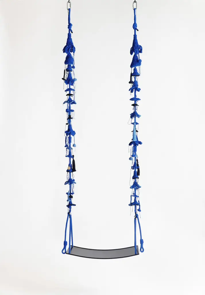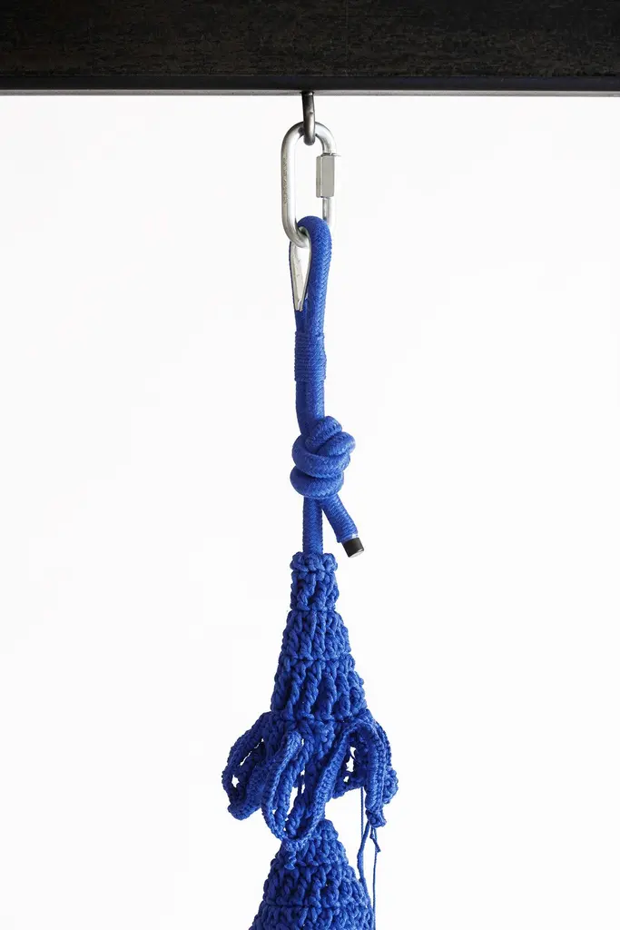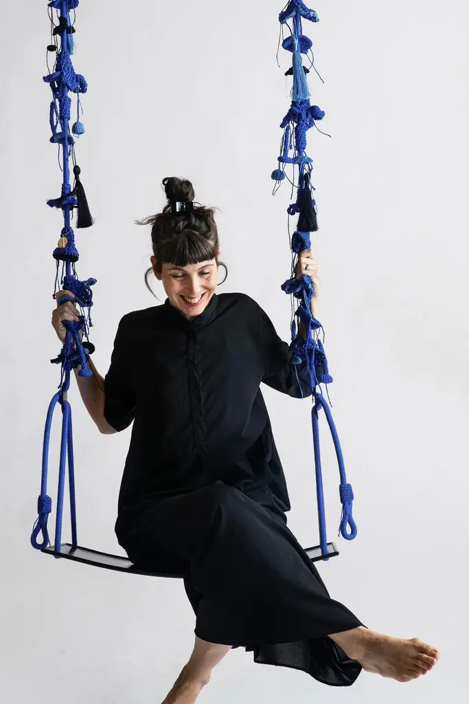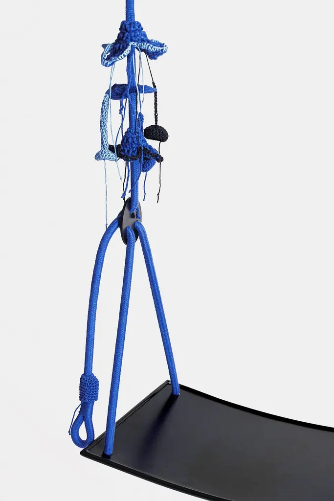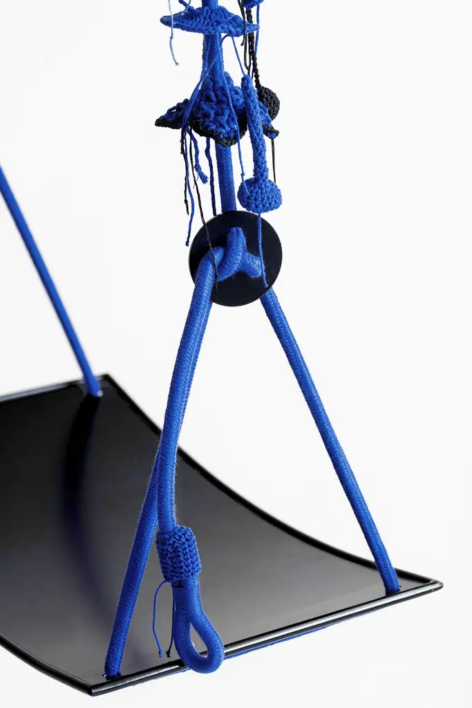 iota swings take the user to a wild, natural, fantastic place. These swings work great in living rooms, spacious bedrooms or hotel lobbies and suites. They are an elegant yet bold choice for both modern-minimalist and boho interiors. Nearly 200 elements form the swing and are hand knit from bespoke yarn designed and produced exclusively by iota from the best quality cotton and polyester. The seat of the swing is made of black coated metal.In addition to being a contemporary design studio iota soft living is a social project that employs, teaches and empowers women who are otherwise unable to work by teaching them the crochet technique and providing them work which they can carry out from their homes.Maintenance - Remove dust regularly with a vacuum cleaner. The use of chemical cleaning materials may harm the product. Try to address stains before they dry, with a moist cloth. Products may vary up to 5% as objects are handmade.Height – The swings are made for a ceiling height of 285cm / 9'4". 2 cabled swings can be adjusted manually 15cm / 5.9" higher or lower. 4 cabled swings are not adjustable and therefore need to be made by order of height. We don't make longer swings but for ceilings higher than 285cm / 9'4" we provide 4mm cables.