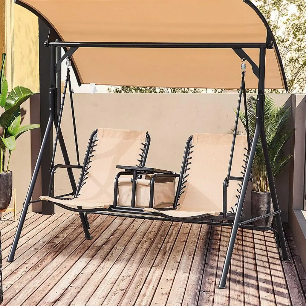Sapphtopaz Porch Swing Glider Chair With Pivot Storage Outdoor Swing With Adjustable Canopy And Cup Holders For Garden, Backyard, Patio, Brown