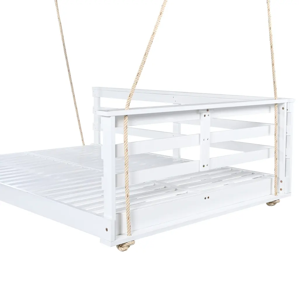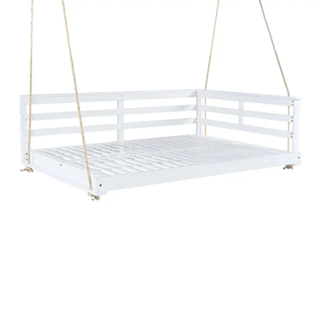 [Premium Acacia Wood&Hemp Rope Construction] Built to withstand the elements, this swing bed features naturally weather-resistant acacia wood and four 96-inch hemp ropes. The wood's rich grain adds rustic elegance, while the ropes ensure secure suspension for years of reliable use in gardens, patios, or sunrooms.[Open-Side Minimalist Design] One side rail is intentionally omitted for easy access and enhanced airflow, creating a breezy lounging experience. The streamlined country-style silhouette complements modern and traditional outdoor spaces alike, with ample room for a full-size mattress (sold separately).[350lbs Weight Capacity&Safety Tested] Engineered for safety, this swing bed supports up to 350lbs. Each hemp rope is rigorously load-tested, and the acacia frame is kiln-dried to prevent warping. Ideal for solo relaxation or cozy moments with loved ones—enjoy peace of mind with every gentle sway.[Quick Setup with Attached Hardware]Includes pre-measured hanging ropes and detailed instructions for hassle-free installation. Adjustable suspension allows customization for optimal comfort, whether hung from sturdy beams, pergolas, or freestanding swing bed stands (sold separately).
